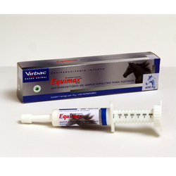 BİLEŞİMİ Her 100 g Equimax Oral Pat, 1.2 g ¡vermektin ve 15 g Praziquantel içeren, beyazımsı renkte; yeşil elma aromasındadır. KULLANIM SAHASI/ENDİKASYONU Equimax Oral Pat atların iç parazitlerinin ergin ve larval dönemleri ve dış parazitlerinin larval dönemlerinin tedavisinde ve bunlardan korunmada kullanılır. Büyük Strongyluslar Strongylus vulgaris (ergin ve arterial larva) Strongylus edentatus (ergin ve ankiste larva) Strongylus equinus (ergin) Triodontophorus sp. (ergin) Küçük Strongyluslar Cyathostomum sp (ergin ve 4. dönem larva) Cylicocylus sp. (ergin ve 4. dönem larva) Cyiicostephanus sp. (ergin ve 4. dönem larva) Cyiicodontophorus sp. (ergin ve 4. dönem larva) Gylocephalus sp. (ergin ve immature form) Askaridler Parascaris equorum (ergin ve 3. ve 4. dönem larva) Kıl kurdu Trichostrongyius axei (ergin) Oxyuris equi (ergin ve 3. ve 4. dönem larva) Mide Bağırsak kıl kurdu Strongyioides westeri (ergin) Draschia megastoma (3. dönem larva) Akciğer kıl kurdu Dictyocauius arnfieidi (ergin ve 4. dönem larva) Cestodlar Anoplocephala perfoiiata Anoplocephela magna Paranoplocephala mamillana Diğerleri Gasterophiius sp. (larvaları) Onchocerca sp. (M ikrofiler) KULLANIM ŞEKLİ VE DOZU Equimax Oral Pat, oral yolla her 60 kg canlı ağırlığa 1 g olacak şekilde (1 kg canlı ağırlığa 0.2 mg ¡vermektin, 2.5 mg Praziquantel) uygulanır. Her bir enjektör üzerindeki çizgi 100 kg vücut ağırlığını tedavi edecek yeterlilikte Oral Pat'ı İfade eder. 10 g'lık enjektörler 600 kg'lık vücut ağırlığını önerilen doz oranında tedavi edebilecek Oral Pat İçerir. |