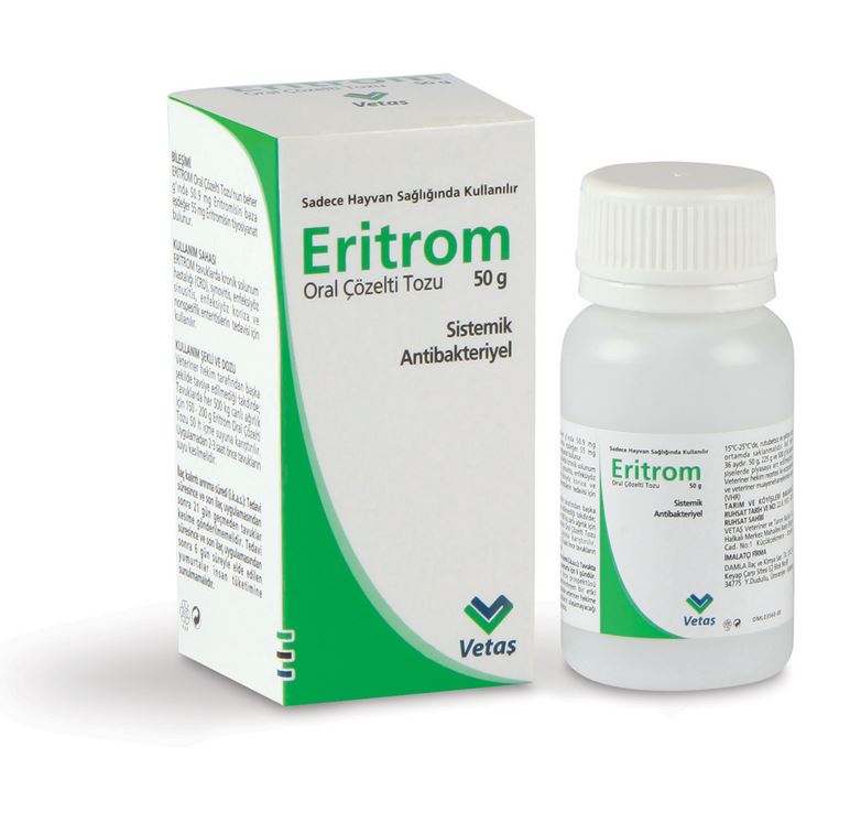 Sadece Hayvan Sağlığında Kullanılır BİLEŞİMİ ERİTROM Oral Çözelti Tozu, açık pembe renkli, homojen görünüşlü bir tozdur ve beher g’da53.6 mg Eritromisin baza eşdeğer 55 mg Eritromisin tiyosiyanat bulunur. FARMAKOLOJİK ÖZELLİKLERİ Eritromisin, Streptomyces erythreus adlı küf mantarının fermantasyon ortamından elde edilen makrolid grubu bir antibiyotiktir. Bakteri ribozomlarının 50S alt ünitesine bağlanarak protein sentezini engelleyerek etkisini gösterir. Özellikle stafilokoklar ve streptokoklar olmak üzere çok sayıdaki gram pozitif mikroorganizmalara karşı güçlü bir etkiye sahiptir. Gram pozitif aeroplar ( Staphylococcus sp., Streptococcus sp. (penisiline dirençli betalaktamaz salgılayanlar da dahil), Bacillus sp., Corynebacterium sp., Erysipelothrix rhusiopathiae), gram negatif aeroblar (Camplyobacter sp., Leptospira sp., Actinobacillus sp.), anaerobik bakteriler (Clostridium sp., Bacteroides sp. (B. fragilis hariç), Actinomyces sp., bazı Fusobacterium sp., anaerobik koklar) eritromisine duyarlıdır. Pasteurella sp., bazı Bordetella türleri, Haemophilus sp., Enterococcus sp., Legionella sp., Ehrlichia sp. orta derecede duyarlılık gösterir. Dirençli bakteriler: Nocardia sp., Pseudomonas sp., Chlamydia psittaci, Mycobacterium sp., Enterobacteriaceae, B. fragilis, E. coli, Klebsiella sp.’dir. Eritromisin oral yolla uygulamadan sonra sindirim kanalından yüksek oranda emilerek, tüm vücuda dağılır. Büyük ölçüde gaita ile atılır. Gaitada bulunan antibiyotik varlığı sindirim sistemindeki gram pozitif bakterileri ciddi şekilde inhibe etmesine rağmen gram negatif bakterilere aynı ölçüde etkimez. Eritromisin önemli miktarlarda idrarla da atılır. KULLANIM SAHASI/ENDİKASYONLAR ERİTROM Oral Çözelti Tozu tavuklarda kronik solunum hastalığı (CRD), synovitis, enfeksiyöz sinusitis, enfeksiyöz koriza ve nonspesifik enteritislerin tedavisi için kullanılır. KULLANIM ŞEKLİ VE DOZU Veteriner hekim tarafından başka şekilde tavsiye edilmediği takdirde; Eritromisin 15-20 mg/kg canlı ağırlık/gün dozunda oral yolla uygulanır. Buna göre tavuklarda her 500 kg canlı ağırlık için 150 - 200 g Eritrom Oral Çözelti Tozu 50 lt içme suyuna karıştırılır. Uygulamadan 2-3 saat önce tavukların suyu kesilmelidir. Tedaviye CRD’de 5, koriza’da 7 gün süreyle devam edilir. İlaçlı su her gün taze hazırlanmalıdır. İSTENMEYEN / YAN ETKİLER Tedavi dozlarında tavuklarda herhangi bir yan etkisi görülmemiştir. İLAÇ GEÇİMSİZLİKLERİ Fenikoller, linkozamidler, diğer makrolid grubu antibakteriyeller ile etki şekillerinin aynı olması nedeniyle birlikte uygulanmamalıdır. Fenobarbital ve karaciğer mikrozomal enzimleri tarafından metabolize edilen diğer ilaçlarla birlikte uygulanmamalıdır. GIDALARDA İLAÇ KALINTILARI HAKKINDA UYARILAR İlaç kalıntı arınma süresi (i.k.a.s.): Tedavi süresince ve son ilaç uygulamasından sonra 21 gün geçmeden tavuklar kesime gönderilmemelidir. Tedavi süresince ve son ilaç uygulamasından sonra 6 gün süreyle elde edilen yumurtalar insan tüketimine sunulmamalıdır. KONTRENDİKASYONLARI Eritromisine duyarlı ve karaciğer yetersizliği olan hayvanlarda kullanılmamalıdır. GENEL UYARILAR Kullanmadan önce ve beklenmeyen bir etki görüldüğü takdirde veteriner hekime danışınız. Çocukların ulaşamayacağı yerde bulundurunuz. MUHAFAZA ŞARTLARI VE RAF ÖMRÜ Orijinal ambalajında, 15-25°C’de, rutubetsiz ve ışıktan uzak ortamda saklandığında raf ömrü imal tarihinden itibaren 24 aydır. TİCARİ TAKDİM ŞEKLİ Karton kutu içerisinde 50 g’lık beyaz renkli plastik şişede, kutusuz olarak 225 g ve 500 g’lık beyaz plastik şişelerde piyasaya arz edilmektedir. SATIŞ YERİ VE ŞARTLARI Veteriner hekim reçetesi ile eczanelerde ve veteriner muayenehanelerinde satılır (VHR) PROSPEKTÜS ONAY TARİHİ: 19.01.2017 GIDA TARIM HAYVANCILIK BAKANLIĞI PAZARLAMA İZİN TARİH – NO: 22.6.1972- 3/263 PAZARLAMA İZİN SAHİBİ ADI VE ADRESİ DEVA Holding A.Ş. Halkalı Merkez Mahallesi Basın Ekspres Cad. No:1 K.Çekmece/İSTANBUL Tel: 0212 692 92 92 Faks: 0 212 697 34 89 e-mail: vetas@vetas.com.tr ÜRETİM YERİ ADI VE ADRESİ DEVA HOLDİNG A.Ş. Çerkezköy Organize Sanayi Bölgesi, Karaağaç Mh. Fatih Bulv. No.26 Kapaklı/ TEKİRDAĞ |