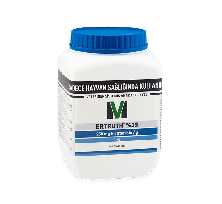 Bileşimi: Farmakolojik Özellikleri: Etki spektrumuna giren bakteriler şunlardır; Gram pozitif aeroblar; Bacillus sp.,Staphylococcus sp., Sterptococcus sp. (penisiline dirençli beta-laktaz salgılayanlar da dahil), Corynebacterium sp.,Erysipelotrixrhusiopathiae, Gram negatif aeroblar; Actinobacillus sp.,Campylobacter sp., Leptospira sp., Anaerobik bakteriler; Clostridium sp.,Bacteroides sp. (B. Fragilis hariç), bazı Fusobacterium sp.,Actinomyces sp., anaerobik koklar. Pasteurella sp.,Haemophilus sp., Enterococcus sp., bazı Bordetella sp., Legionella sp., Erhlichiatürleri orta derecede duyarlıdır. Mycobacterium sp.,Nocardia sp., Enterobacteriaceae, E. coli, Klebsiealla sp., Pseudomanas sp., B. fragilis, Chlamydiapsittacidirençlidir. ERTRUTH % 35 Oral Çözelti Tozu, oral yolla verildikten sonra, ince bağırsakların üst kısmından kolayca emilir, 1 – 2 saat içinde pik plazma konsantrasyonuna ulaşır ve hızla tüm vücut doku ve sıvılarına dağılır; Karaciğer, akciğer ve böbreklerde yüksek oranda bulunur. Vücuttan büyük ölçüde safra ile daha düşük miktarlarda da idrar yoluyla atılır. Endikasyonları: Uygulama Şekli ve Dozu: |