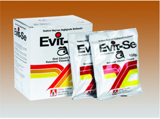 BİLEŞİMİ Evit-Se oral çözelti tozu beyaz-kirli beyaz renkte, kendine has kokulu suda dağılan toz olup 100 gram Evit-Se içinde E vitamini 3.000 mg. KULLANIM SAHASI/ENDİKASYONLAR Kümes hayvanlarında E vitamini ve selenyum noksanlığına bağh encephalomalacia. kas distrofileri, hemorajik diathesis ve diğer noksanlık hastalıklarının; at, sığır ve koyunlarda E vitamini ve selenyum noksanlığına bağh kas distrofilerinin tedavisinde; kuzu, buzağı ve oğlaklarda Beyaz Kas Hastalığının korunma ve tedavisinde kullanılır. KULLANIM ŞEKLİ VE DOZU Evit-Se içme sularına katılmak ya da su veya sütle karıştırılıp ağız yolundan içirilmek suretiyle kullanılır. Veteriner hekim tarafından başka şekilde önerilmediği takdirde: Kanatlılarda, tedavi amacıyla 20 litre içme suyuna 100 g (1 poşet): koruma amacıyla 40 litre içme suyuna 100 g katılır. Bu uygulama 5-7 gün süre ile devam ettirilir. At, sığır, koyun ve keçilerde koruyucu olarak 40-50 kg vücut ağırlığı için 10 g bir defa verilir; 2-3 hafta aralıklarla 4-5 defa veya ihtiyaç duyulduğu sürece tekrarlanır. Kuzu, buzağı ve oğlaklarda Beyaz Kas Hastalığına karşı koruyucu olarak 20 kg vücut ağırlığı için 5 g dozunda 1 defa verilir; ihtiyaç duyuldukça 2-3 hafta aralıklarla bu uygulamaya devam edilir. Beyaz Kas Hastalığının tedavi dozu da 20 kg vücut ağırlığı için günlük 5 g.dır. Ancak bu doz klinik şifa durumuna göre gerekirse 2-3 gün aralıklı olarak 1 veya 2 defa tekrarlanabilir. |