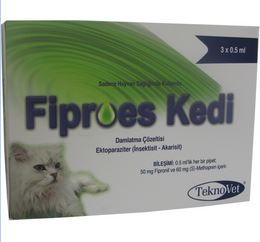 BİLEŞİMİ Her ml’de 100 mg Fipronil ve 120 mg (S)-Methopren. KULLANIM YERİ / ENDİKASYONLARI Fiproes Kedi Damlatma Çözeltisi kedilerde; Pire (Ctenocephalides spp.), Kene (Rhipicephalus spp., Dermacentor spp., Ixodes spp.), Isırıcı bit (Felicola subrostratus) enfestasyonlarında tedavi ve kontrol amacı ile, Pirelerden ileri gelen alerjik dermatitis (FAD) kontrolünde, Pire yumurtaları, larva ve pupalarının gelişmelerinin engellenmesinde kullanılır. Akarların tam olarak eliminasyonu için birden fazla sayıda aylık uygulama tavsiye edilmiştir. Fiproes Kedi Damlatma Çözeltisi kedilerde ergin, larva veya pupa halindeki pireler ve pire yumurtalarına karşı yaklaşık 6 hafta süreyle ve enfestasyon yoğunluğuna bağlı olarak, kene enfestasyonlarına karşı 1 ay süre ile etkilidir. Hayvanın vücuduna yeni gelmiş pireler 24 saat içinde ölür. KULLANIM ŞEKLİ VE DOZU Veteriner hekim tarafından başka şekilde tavsiye edilmediği takdirde; Fipronil’in genel farmakolojik dozu kedilerde 5 mg / kg, (S)-Methopren’in ise 6 mg/ kg‘dır. Fiproes Kedi Damlatma Çözeltisi lokal olarak deriye uygulanır. Deri üzerine damlatma şeklinde uygulama yapılır. Pratik doz tablosu şöyledir ;