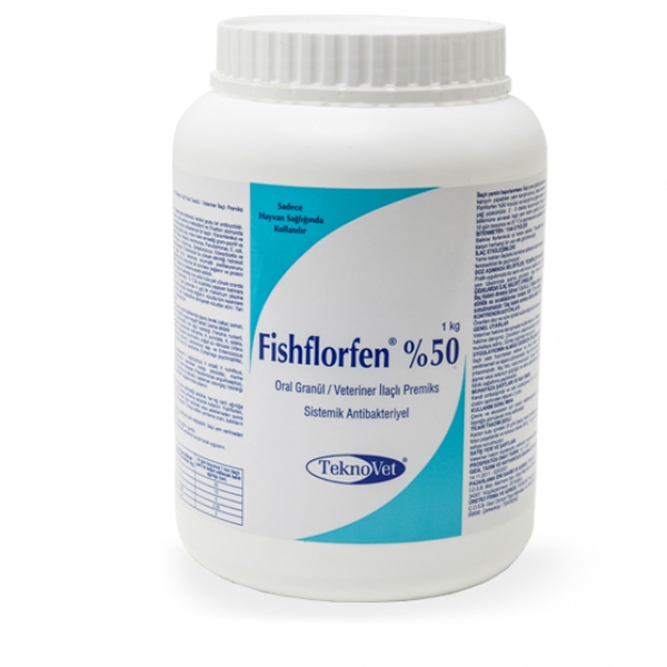 KULLANIM YERİ / ENDİKASYONLARI Fishflorfen %50 Oral Granül; tatlı (alabalık, sazan) ve deniz balıklarında (çipura, levrek, kalkan, somon, mercan) hastalık etkeni olan çok sayıda gram-pozitif ve gram-negatif bakteri üzerine etkilidir. Alabalıklarda: Furunculosis (Aeromonas salmonicida), kızıl ağız hastalığı (Yersinia ruckerii, yersiniosis), bakteriyel hemorajik septisemi (Aeromonas hydrophila, A. punctata, A. sobria, Pseudomonas sp.), kolumnaris hastalığı (Flexibacter columnaris), soğuk su vibriosisi (Vibrio salmonicida), ülser hastalığı (Haemophilus piscium), Lactococcus sp. ve Enterococcus sp.’lerin neden olduğu hastalıklar, rainbow trout fry syndrome (Cytophaga psychrophila), edwardsiellosis sağaltımında kullanılır. Çipura ve levreklerde: Vibriosis (Vibrio anguillarum, V. alginolyticus, V. ordalii, V. vulnificus, Vibrio sp.), pasteurellosis (Photobacterium damselae subsp. piscicida), marine flexibacteriosis (Tenacibaculum maritimum), winter diseases (Pseudomonas anguilliseptica), streptokokkozis (Streptococcus iniae, Streptococcus faecalis), bakteriyel solungaç hastalığı (Flexibacter sp., Cytophaga sp.) gibi hastalıkların sağaltımında kullanılır.