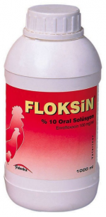 Bileşimi Her ml’de 100 mg Enrofloksasin baz içeren oral bir çözeltidir. Kullanım yeri Etçi tavuklarda enrofloksasine duyarlı bakterilerden kaynaklanan enfeksiyonların sağıtımında kullanılır. Bu kapsamda etçi tavuklarda Mycoplasmosis (CRD-Kronik Solunum Yolu Hastalığı), Colibacillosis, Salmonellosis, Pasteurellosis, Staphylococcosis hastalıklarında endikedir. Kullanım şekli ve Dozu Kanatlılarda 10 mg/kg c.a./gün dozu hesabıyla içme suyu içine uygulanır. Su tüketimine bağlı olarak değişmekle birlikte, her 1000 kg c.a. için 100 ml Floksin 200 litre içme suyuna katılır. Tedaviye 3-5 gün devam edilmelidir. Salmonella ve Pasteurella türleri tarafından meydana getirilen enfeksiyonlarında 5-10 gün kullanılması tavsiye edilir. İlaçlı içme suyu günlük olarak hazırlanmalı ve kullanılmalıdır. Uygulama öncesi içme suyunun temiz olmasına ve asit karakter taşımamasına dikkat edilmelidir. Enrofloksasin çözeltisi alkali ortamlarda daha stabil olduğundan uygulama temiz içme suyu ile yapılmalı ve hayvanlar akşamdan susuz bırakılarak ilaç 2 saat içinde içecekleri su miktarı içinde verilmelidir. |