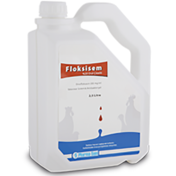 FLOKSİSEM; %20 Oral Çözelti; berrak, sarımsı renkli, kokusuz, akıflkan bir çözelti olup her ml'sinde 200 mg enrofloksasin içerir. Etçi tavuk ve hindilerde enrofloksasine duyarlı bakterilerden kaynaklanan enfeksiyonların sağaltımında kullanılır. Bu kapsamda etçi tavuk ve hindilerde başlıca E. coli'den ileri gelen septisemi ve ishaller, colibasillozis, hava kesesi enfeksiyonları, Salmonellosis, Mycoplasma gallisepticum, M. synoviae, M. meleagridis, M. Iowae enfeksiyonları, Pasteurellosis, Staphylococcosis, Pseudomonas aeroginosa, Heterakis gallinarum, Erysipelothrix rhusipathia etkenlerine bağlı enfeksiyonlar ve mix enfeksiyonlar ile viral hastalıkların sekonder bakteriyel etkenlerden kaynaklanan enfeksiyonlarında endikedir. Etçi tavuk ve hindiler için formüle edilmifl FLOKSİSEM %20 Oral Çözelti, 10 mg/kg canlı ağırlık/gün genel enrofloksasin dozu hesabıyla içme suyuna katılarak oral yolla uygulanır. İlaçlı içme suyu günlük olarak hazırlanmalı ve kullanılmalıdır. Enfeksiyonların nedenine, fliddetine ve Veteriner Hekimin öngörüsüne göre 3-10 gün boyunca kullanılır. Et tipi tavuklarda; FLOKSİSEM %20 Oral Çözelti'nin 50 ml'si 1000 kg canlı ağırlık için günlük gereken miktardır. 1 ton canlı ağırlığa 50 ml Floksisem kullanılır. 2,5 L'lik ambalajda satışa sunulmuştur. |