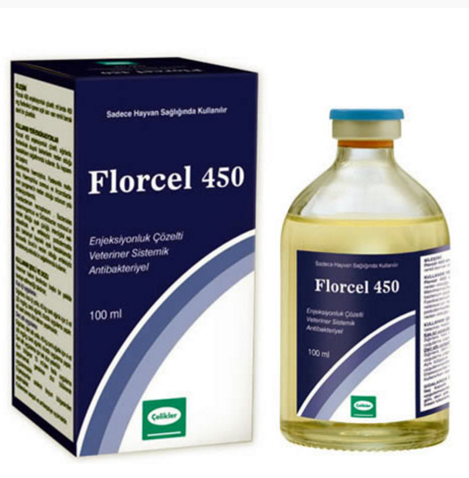 BİLEŞİMİ Florcel 450; ml’sinde 450 mg Florfenikol içerir. ENDİKASYONLAR Florcel 450 enjeksiyonluk çözelti, sığırlarda, florfenikole duyarlı bakterilerin neden olduğu;Mannheimia haemolytica, Pasteurella multocida, Haemophilus somnus ve Arcanobacterium pyogenes’in neden olduğu solunum yolu enfeksiyonlarında, Fusobacterium necrophorum, Bacteriodes meleninogenicus veDichelobacter nodosus’un neden olduğu ayak çürüğü, interdigital nekrobasillozis ve enfeksiyöz pododermatitis gibi bakteriyel kaynaklı ayak hastalıklarında; Moraxella bovis’in neden olduğu enfeksiyöz keratokonjunktivitis’in sağaltımında kullanılır. KULLANIM ŞEKLİ VE DOZU Veteriner hekim tarafından başka bir şekilde tavsiye edilmediği takdirde; Kas içi uygulama: Sığırlara, kas içi yolla, 45 kg canlı ağırlık için 2 ml (20 mg/kg canlı ağırlık) dozda uygulama yapılır. 48 saat sonra doz tekrarı yapılmalıdır. Deri altı uygulama: Sığırlara, deri altı yolla, 45 kg canlı ağırlık için 4 ml (40 mg/kg canlı ağırlık) dozda uygulama yapılır. Deri altı uygulama için tek doz yeterlidir. Aynı bölgeye 10 ml’den fazla uygulama yapılmamalı, gerekirse doz bölünerek uygulanmalıdır. |