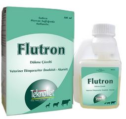 BİLEŞİMİ Her ml’de 10 mg Flumetrin içerir. KULLANIM YERİ /ENDİKASYONLARI Flutron Dökme Çözelti; Sığır ve koyunlarda olgun ve gelişme dönemindeki tek ve çok konakçılı keneler (Boophilus spp., Hyalomma spp., Rhipicephalus spp., İxodes ricinus, Amblyomma spp., Dermacentor spp.,) ile emici ve sokucu bitler (Haematophinus sternus, Linognathus vituli, Bovicola bovis, B. ovis, Melophagus ovinus), ısırıcı sinekler ve psoroptes uyuzu (Psoroptes ovis) etkenlerine bağlı enfestasyonların ve köpeklerde demodex uyuzu etkenine bağlı enfestasyonların tedavi ve kontrolünde kullanılır. KULLANIM ŞEKLİ VE DOZU Veteriner hekim tarafından başka şekilde tavsiye edilmediği taktirde; polietilen şişenin kapağı açılır, şişe hafifçe sıkılarak üstteki bölmeye gerekli miktardaki çözeltinin dolması sağlanır. Daha sonra şişe serbest bırakılarak bölmedeki çözelti sığırlarda; hayvanın cidago bölgesinden başlayarak kuyruk sokumuna kadar (sırt çizgisi boyunca) dökerek uygulanır. Flumetrin’in dökme çözelti halinde uygulama dozu parazit türüne göre değişmektedir. Flumetrin‘in farmakolojik dozu kenelere ve sokucu bitlere karşı 1 mg / kg c.a., emici bitlere ve psoroptes uyuzuna karşı 2 mg / kg canlı ağırlıktır. Buna göre Flutron Dökme Çözelti aşağıdaki pratik dozlarda uygulanır.