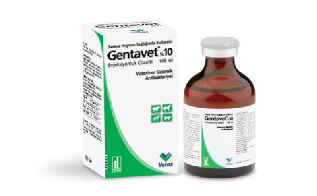 Sadece Hayvan Sağlığında Kullanılır BİLEŞİMİ GENTAVET %10 Enjeksiyonluk Çözelti, sarı renkli, berrak, steril bir çözelti olup, beher ml’de etkin madde olarak 100 mg gentamisine eşdeğer gentamisin sülfat ve yardımcı madde olarak metil paraben, propil paraben ve sodyum metabisülfit içerir. FARMAKOLOJİK ÖZELLİKLERİ Gentamisin, aminoglikozid yapılı ve orta spektrumlu bir antibiyotiktir. Bakterisid etkisini, kendisine duyarlı mikroorganizmalarda ribozomun 30 S alt ünitesine geri dönüşümsüz bağlanmak suretiyle protein sentezini inhibe ederek gösterir. Gentamisine başlıca duyarlı bakteriler şunlardır; E. coli, Enterobacter spp., Campylobacter spp., Klebsiella spp., Yersinia spp., Serratia spp., Haemophilus spp., Pasteurella spp.. Çoğu Pseudomonas aeroginosa suşları ve Staph. aureus çoğunlukla duyarlıdır. Ancak Streptococcus spp.’lerin de aralarında bulunduğu diğer gram pozitif bakteriler, bazı Pseudomonas spp. ve anaerob bakteriler gentamisine dirençlidir. Gentamisin, kas içi (i.m.) yolla verildiğinde 15 dakika sonra etkili olur ve bir saatin içerisinde de maksimum kan yoğunluğuna ulaşır. %25-30 oranında serum proteinlerine bağlanır. Vücudun dokusal kesimlerine hızla ve geniş ölçüde dağılır. Plasenta, plöra ve periton boşluklarına geçer. Büyük oranda değişmemiş halde idrarla atılır. Çok az miktarlarda olmak üzere safra ve sütle de atılır. KULLANIM SAHASI/ENDİKASYONLAR Sığır, at, köpek ve kedilerde;