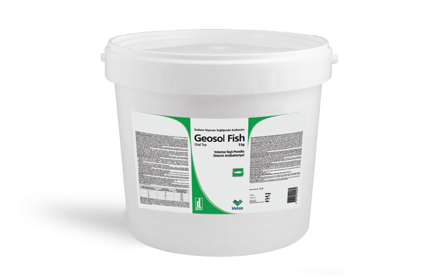 KULLANIM ŞEKLİ VE DOZU Veteriner hekim tarafından başka şekilde tavsiye edilmediği taktirde; Farmakolojik doz: Beher kilogram balık için etken madde miktarı genel enfeksiyonlar için 75 mg/kg c.a., Yavru Gökkuşağı Alabalık Sendromu 200 mg/kg c.a. ‘dır. Pratik doz: beher kilogram balık için 0,1 g GEOSOL FISH Oral toz Yavru Gökkuşağı Alabalık Sendromu 0,27 g GEOSOL FISH Oral toz /kg canlı ağırlık olarak hesaplanarak balık yemlerine karıştırmak suretiyle uygulanır. Balığın tüketeceği yem miktarı vücut ağırlığının % 1 olarak hesaplandığında, beher kilogram yem için gereken GEOSOL FISH Oral Toz /VİP toz miktarı 10 g, Yavru Gökkuşağı Alabalık Sendromunda 2,7 g’dır. GEOSOL FISH Oral toz /VİP, 7 gün boyunca verilir. Yavru gökkuşağı alabalık sendromunda 20 güne kadar verilir.