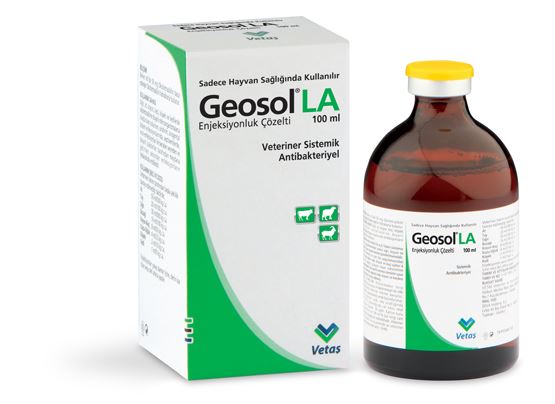 Sadece Hayvan Sağlığında Kullanılır BİLEŞİMİ GEOSOL LA Enjeksiyonluk Çözelti, berrak sarı-kahverenkli bir çözelti olup beher ml’sinde 200 mg Oksitetrasiklin baza eşdeğer oksitetrasiklin dihidrat içerir. FARMAKOLOJİK ÖZELLİKLERİ Oksitetrasiklin, tetrasiklin grubundan geniş spektrumlu, bakteriyostatik etkili bir antibakteriyeldir. Etkisini, bakterilerde ribozomun 30S alt ünitesine geri dönüşümsüz bir şekilde bağlanmak suretiyle protein sentezini inhibe ederek gösterir. Gram pozitif aeroblar (Bacillus sp., Corynebacterium sp., Erysipelothrix rhusiopathia, Listeria monocytogenes ve Streptococci), Gram negatif bakteriler (Actinobacillus sp., Bordetella sp., Francisella tularensis, Haemophilus sp., Pasteurella multocida, P. haemolytica, Yersinia sp. Campylobacter fetus, Borrelia sp. ve Leptospira sp., Moraxella bovis), anaeroblar (Actinomyces sp., Fusobacterium sp.) ve Mycoplasma sp., Chlamydia sp., Ehrlichia sp., Coxiella burnetti, Ehrlichia, Theileria, Eperythrozoon ve Anaplasma’lara etkisi iyi derecededir. Kazanılmış direnç nedeniyle, Staphylococci, Enterococci, Enterobacter sp. Enterobactericeae familyasına dahil Enterobacter sp. E.coli, Klebsiella sp., Proteus sp., Salmonella sp., Anaerob bakterilerden Bacteroides sp. ve Clostridium sp.’ye etkisi değişkendir. Mycobacterium sp., Proteus vulgaris, Pseudomonas aeroginosa, Serratia sp., Mycoplasma bovis ve M. hyopneumoniae tetrasiklinlere dirençli kabul edilir. GEOSOL LA Enjeksiyonluk Çözelti, kas içi uygulama sonrası, enjeksiyon bölgesinden çok iyi absorbe edilir. Organizmada kolayca dağılır ve kısa zamanda etkili terapötik düzeylere çıkar. Uygulama sonrası kısa bir süre içerisinde kan ve diğer vücut sıvı ve dokularında tespit edilebilir. İdrar ve safra ile değişmeden atılır. KULLANIM SAHASI / ENDİKASYONLARI GEOSOL LA Enjeksiyonluk Çözelti sığır, koyun ve keçilerde duyarlı bakteriler tarafından oluşturulan aşağıda belirtilen hastalıkların tedavisi için kullanılır: