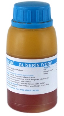 BİLEŞİMİ Kırmızımsı kahve renkli 160 ml’lik çözelti 2 g iyot (%0.97) ve 4 g potasyum iyodür (%1.94) ihtiva eder. FARMAKOLOJİK ÖZELLİKLER İyot, bakteri, virüs ve mantarlara, etkili yoğunluklarda da sporları etkileyen geniş spektrumlu bir antiseptiktir. Etkisini mikroorganizmaların içine nüfus ederek hayati metabolik reaksiyonları etkilemek suretiyle gösterir. Taşıt madde olarak nemlendirici ve yumuşatıcı özelliklere sahip gliserin kullanıldığından ağız ve mukoza antisepsisinde de kullanılabilir. KULLANIM SAHASI ve ŞEKLİ Hayvanların diş eti ile , ağız ve diğer mukozalarının hastalıklarında ve deri yaralarında antiseptik olarak kullanılır. Günde 3-4 kez hastalıklı bölgeye iyileşme oluncaya kadar geçinceye kadar sürülür. İSTENMEYEN ETKİLER Uzun süreli kullanımında uygulanan bölgelerde irritasyon oluşabilir. İLAÇ ETKİLEŞİMLERİ Dezenfektan aktivesini azaltabileceğinden dolayı alkalilerle birlikte kullanılmamalıdır.Hayvanlar üzerine harici uygulamalarda dokuda kimyasal bir yanık oluşturabileceğinden civalı antiseptiklerle birlikte kullanılmamalıdır. GIDALARDA İLAÇ KALINTI UYARILARI İlaç Kalıntı Arınma Süresi (i.k.a.s) “0” gündür. KONTRENDİKASYONLAR Hipertiroidizm ve gebelikte kullanılmamalıdır. Açık ve çok geniş yaralarda kullanılmamalıdır. GENEL UYARILAR Kullanmadan önce ve beklenmeyen bir etk görüldüğünde veteriner hekime danışınız. Gıdalardan uzakta ve çocukların ulaşamayacağı yerlerde bulundurunuz. MUHAFAZA ŞARTLARI ve RAF ÖMRÜ Orijinal ambalajında, kapalı olarak ve oda sıcaklığında saklanmalıdır. Raf ömrü 2 yıldır. TİCARİ TAKDİM ŞEKLİ 160 ml’lik beyaz plastik kavanozlarda arzedilmiştir. |