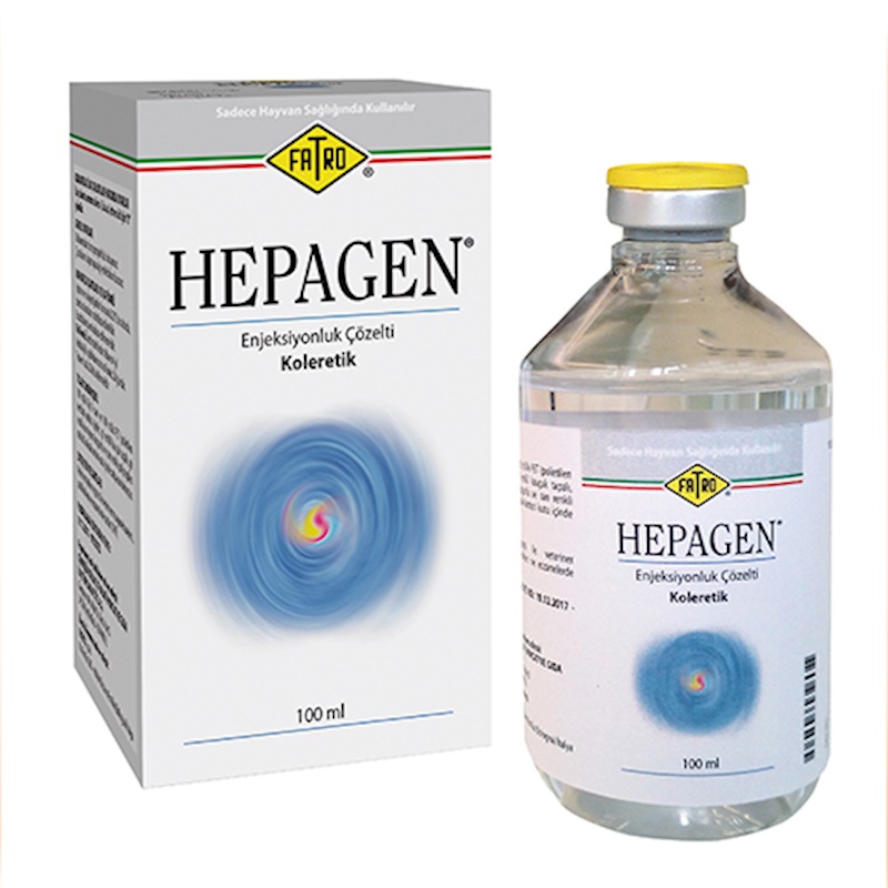 Hepagen BİLEŞİMİ: HEPAGEN Enjeksiyonluk Çözelti, beher ml’de 100 mg. fenoksi-2-metil-2-propiyonik asit (112,2 mg sodyum tuzu olarak), 0.16 mg sodyum metil parahidroksit benzoat ve 0.08 mg sodyum propil parahidroksit benzoat ihtiva eden steril berrak, renksiz bir çözeltidir. KULLANIM SAHASI ve ENDİKASYONLARI Sığırlar – Keçilerde: Besin zehirlenmesi, işkembenin aşırı yüklenmesi, gaz ve hazımsızlık, asetonemi (ketoz) tedavisinde, distomatoz ve kum kelebeği (dicrocoeliasis) vakıalarında tedaviye yardımcı olarak kullanılır. Atlarda: Dengesiz beslenmeye bağlı karaciğer bozukluklarının tedavisinde, piroplazmoz ve leptospiroza bağlı karaciğer yetmezliğinde tedaviye yardımcı olarak kullanılır. Köpeklerde: Sarılık, karaciğer yetmezliği tedavisinde, leptospiroz ve gençlik hastalığı vakıalarında tedaviye yardımcı olarak kullanılır. Hepagen Kullanım Şekli ve DozuVeteriner hekim tarafından başka şekilde tavsiye edilmediği takdirde; Hedef türler için farmakolojik doz: 10 mg fenoksi-2-metil-2-propiyonik asit /kg canlı ağırlıktır. Uygulama derin kas içi, periton içi veya yavaş damar içi yapılmalıdır. Yetişkin sığır ve atlarda : 300 kg’a canlı ağırlığa kadar : 30 ml Buzağı-tay-keçilerde: 5 -15 ml Köpeklerde : 1ml / 10 kg canlı ağırlık dozunda Uygulama veteriner hekimin önerisine göre her 24 saatte bir olmak üzere 1- 3 gün veya daha uzun süreyle tekrarlanabilir. GIDALARDAKİ İLAÇ KALINTILARI HAKKINDA UYARILAR İlaç kalıntı arınma süresi (i.k.a.s.): Et ve süt için “0” gündür. MUHAFAZA ŞARTLARI VE RAF ÖMRÜ Işıktan ve ısı kaynağından korunarak 25 0 C’nin altında, dondurulmadan muhafaza edilmelidir. Buzdolabında muhafaza edilmemelidir. Raf ömrü: Üretim tarihinden itibaren 4 yıl Ambalaj ilk açıldıktan sonra raf ömrü: 28 gündür. Tıpa en fazla 20 defa delinmelidir. TİCARİ TAKDİM ŞEKLİ 100 ml.lik Tip II cam ve 100 ml.lik PET(polietilen terefilat) renksiz şişeler, gri renkli kauçuk tapalı, gri renkli aluminyum kapşonlu ve sarı renkli polipropilen mühürlü olarak karton kutu içinde satışa sunulmuştur. |