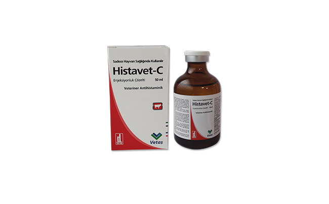BİLEŞİMİ Histavet-C Enjeksiyonluk Çözelti, renksiz, berrak, steril bir çözelti olup, beher ml’de etkin madde olarak 7.03 mg klorfeniramine eşdeğer 10 mg klorfeniramin maleat ve yardımcı madde olarak antimikrobiyal koruyucu amaçlı 1.00 mg metil paraben ve 0.20 mg propil paraben içerir. FARMAKOLOJİK ÖZELLİKLERİ Farmakodinamik özellikler: Klorfeniramin maleat, kimyasal özelliklerine göre hücre zarı üzerinde bulunan H1 reseptörüne bağlanabilen ve dolayısıyla doğal endojen ligand ile rekabet edebilen alkilamin grubu antihistaminik olarak sınıflandırılan rasemik bir bileşiktir. Klorfeniramin maleat, doğrudan reseptör düzeyinde farmakolojik tepkimelere neden olmaz ancak histamin tarafından tetiklenenleri inhibe eder. Bu gözlemlere dayanarak klorfeniramin maleat, doğrudan ya da tersine çevrilebilir yarışmalı reseptör antagonisti olarak görev yapar. Klorfeniramin maleat, histamin sentezini ya da salınımını engelleyememektedir. Farmakokinetik özellikler: Anti-H1 antihistaminikleri, tek mideli hayvanlarda oral yolla uygulama sonrası yeterli seviyede emilmektedir; aynı durum geviş getiren hayvanlarda söz konusu değildir. Etkileri genelde oral yolla uygulanmasının ardından 20-45 dakika sonra görülmekte ve yaklaşık 3-12 saat sürmektedir. Damar yolu ile uygulamanın ardından ilacın plazma konsantrasyonu, uygulamayı takip eden 24 saat sonunda 36 ng/ml’den yöntemin kantitatif limitine (1 ng/ml) düşmektedir. Hesaplanan eliminasyon yarı ömrü (T1/2β) 2.11 saat, ortalama kalma süresi (MRT) 2.35 saat, toplam klerens (ClB) 1.315 l/kg/s ve dağılım hacmi (Vd) 3 l/kg’nın biraz üzerindedir. Kas içi uygulamadan sonra maksimum konsantrasyona (Cmax=142 ng/ml) 28 dakikada (Tmax) ulaşmaktadır. Daha sonra plazma konsantrasyonları hızlı bir şekilde azalarak 2 ve 8 saatin sonunda 60 ve 12 mcg/kg değerlerine, uygulamadan 24 saat sonra kantitatif limitin (1 mcg/kg) altına inmektedir. MRT ve biyoyararlanım sırası ile 3.58 saat ve %100 olarak tespit edilmiştir. Ürünün ve metabolitlerinin ana eliminasyon yolu böbrek aracılığıyla olup, 24 saat içerisinde çok az bir kısmı değişime uğramamış şekilde, geriye kalan kısmı bozunum ürünü olarak idrar ile atılmaktadır. KULLANIM SAHASI/ENDİKASYONLAR Histavet-C Enjeksiyonluk Çözelti, sığırlarda histamin salınımına bağlı durumların semptomatik tedavisinde kullanılır. KULLANIM ŞEKLİ VE DOZU Veteriner hekim tarafından başka şekilde tavsiye edilmediği takdirde; Histavet-C Enjeksiyonluk Çözelti, kas içi (IM) ya da yavaş damar içi (IV) olarak uygulanır. Yetişkin hayvanlarda: 0.5 mg klorfeniramin maleat/kg vücut ağırlığı (5 ml Histavet-C / 100 kg vücut ağırlığına denk), 3 gün boyunca günde 1 defa. Genç hayvanlarda: 1 mg klorfeniramin maleat/kg vücut ağırlığı (10 ml Histavet-C / 100 kg vücut ağırlığına denk), 3 gün boyunca günde 1 defa. ÖZEL KLİNİK BİLGİLER VE HEDEF TÜRLER İÇİN UYARILAR Anlık tedavi edici etkilere sahip olmasına rağmen damar içi kullanım, Merkezi Sinir Sistemi üzerinde uyarıcı etkilere neden olabilmektedir. Bu nedenle damardan kullanımın zorunlu olduğu hallerde yavaşça zerk edin ve gerektiğinde birkaç dakika ara verin. Deri altı (SC) uygulama yapılmamalıdır. Damar içi enjeksiyon yavaş verilmelidir. Gebelik ve Laktasyonda Kullanım: Antihistaminlerin gebelik ve laktasyon döneminde kullanımlarının güvenirliği hakkında bilgi bulunmamaktadır. Veteriner hekim tarafından yapılan fayda/risk değerlendirmesinin ardından kullanılmalıdır. İSTENMEYEN/YAN ETKİLER Zayıf yatıştırıcı etkisi bulunabilir. İLAÇ ETKİLEŞİMLERİ Antihistaminikler ile barbitüratlar birlikte kullanıldığında, klorfeniramin maleatın yatıştırıcı etkisini arttırabilir. Antihistaminiklerin kullanılması bazı antibiyotiklerin ilk ototoksisite belirtilerini gizleyebilir ve ağız yolu ile verilen pıhtılaşma önleyicilerinin etki süresini azaltabilir. Uyumluluk araştırmaları bulunmadığından diğer veteriner amaçlı tıbbi ürünler ile karıştırmayın. GIDALARDA İLAÇ KALINTILARI HAKKINDA UYARILAR İlaç kalıntı arınma süresi (i.k.a.s.): Tedavi süresince ve son ilaç uygulamasından sonra sığır et ve sakatat için 24 saat geçmeden kesime gönderilmemelidir. Süt için kalıntı arınma süresi 12 saat / 1 sağımdır. KONTRENDİKASYONLAR Aşırı duyarlı olduğu bilinen hayvanlarda kullanılmamalıdır. DOZ AŞIMINDA BELİRTİLER, TEDBİRLER VE ANTİDOT Terapötik dozun dört katına kadar uygun şekilde tolere edilebilmektedir. KULLANIM SONU İMHA VE HEDEF OLMAYAN TÜRLER İÇİN UYARILAR Kullanılmayan ürünler ya da atık materyaller yerel yasaların gerekliklerine uygun olarak imha edilmelidir. GENEL UYARILAR Kullanmadan önce ve beklenmeyen bir etki görüldüğünde veteriner hekime danışınız. Çocukların ulaşamayacağı yerde bulundurunuz. UYGULAYICININ ALMASI GEREKEN ÖNLEMLER VE HEKİMLER İÇİN UYARILAR Kazara kendi kendine enjeksiyondan kaçınılmalıdır. Kullanım sonrası eller yıkanmalıdır. Yanlışlıkla kendi kendine enjeksiyon durumunda derhal tıbbi yardım alın ve bu prospektüsü doktora gösterin. Sedasyona neden olabilir. MUHAFAZA ŞARTLARI VE RAF ÖMRÜ 25°C’nin altındaki oda sıcaklığında, buzdolabına ve/veya derin dondurucuya konulmadan, orijinal ambalajında saklandığında raf ömrü 24 aydır. Açıldıktan sonra 25°C’nin altındaki oda sıcaklığında 28 gün içinde kullanılmalı ve buzdolabında ve/veya derin dondurucuda saklanmamalıdır. Tıpası en fazla 40 kez delinebilir. TİCARİ TAKDİM ŞEKLİ Karton kutu içinde, 50 mL ve 100 mL’lik amber renkli Tip II cam flakonlarda sunulmaktadır. Flakonlar, kırmızı renkli klorobutil 20 mm lastik tıpa ve beyaz flip-off kapak ile kapatılmıştır. SATIŞ YERİ VE ŞARTLARI Veteriner hekim reçetesi ile eczanelerde, veteriner hekim muayenehane, p