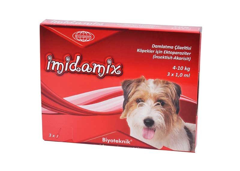 İMİDAMİX Damlatma Çözeltisi Köpekler için Ektoparaziter (İnsektisit-Akarisit) 1 ml – 2,5 ml – 4 ml Bileşimi 100 ml’si 10 g İmidacloprid ve 50 g Permetrin içerir. Aromatik kokulu, beyaz renkli yağlı bir çözeltidir. Kullanım Sahası köpeklerde kene, pire, sivrisinek ve tatarcık gibi dış parazitlere karşı kullanılır. Köpeklerin derisine uygulandıktan sonra çözelti hızlı bir şekilde vücut yüzeyine dağılır. Her iki aktif madde de, uygulanan hayvanın deri ve tüylerinde 4 hafta boyunca etkindir. Etkili olduğu dış parazitler aşağıda gösterilmiştir. Kullanım Şekli ve Dozu 1 ml, 2,5 ml ve 4 ml’lik mikro tüpler içinde 3’lü, 4’lü, 5’li karton kutular ve karton kutu içerisinde 30 ml’lik damlalıklı plastik şişeler.