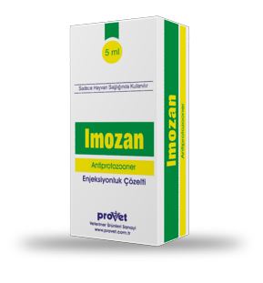 IMOZAN BİLEŞİMİ Renksiz , berrak , steril çözeltinin her ml.si 120 mg imidocarb dipropionate içerir. FARMAKOLOJİK ÖZELLİKLERİ İmidocarb antiprotozoer aktivite gösteren bir carbanilide derivesidir.Parazit hücrelerinde hücre çekirdeğinin sayısı ve büyüklüğünde artışa ve staoplazmada vakuoller şekillenmesine yol açar. Böylece parazitin hücresel seviyede poliamin üretmesi ve kullanması engellenir veya parazitin eritrositleri içine inositol girişi durdurulur. İmidocarbın piroplasmosis etkenlerine karşı öldürücü etkisinin yanısıra sığırlarda hastalığa karşı koruma da sağlaması diğer ilaçlara karşı önemli bir üstünlüğüdür. Derialtı uygulamadan sonra hızla emilir ve 1 saat içinde maksimum plazma konsantrasyonuna ulaşır ve 4 saat süreyle yüksek plazma seviyesi gözlenir.Uygulamadan sonraki 24 saat içinde verilen dozun yüzde yetmiş kadarı plazma proteinlerine bağlanmış olur.Kasiçi uygulamadan sonra 4 hafta boyunca dokularda imidocarbın ölçülebilir yoğunlukları saptanabilir. Daha çok dışkı ile az bir oranda da idrarla atılır.Atılan miktarın çoğunluğunu metabolize olmamış imidocarb oluşturur. ÖZEL KLİNİK BİLGİLER VE HEDEF TÜRLER İÇİN UYARILAR İmidocarb oldukça toksik bir bileşiktir.Deneysel çalışmalarda laboratuvar hayvanları için güvenli bir ilaç olmasına rağmen evcil hayvanlardaki güvenlik aralığı düşüktür. Bazen tedavi dozunda akut zehirlenme belirtileri ortaya çıkabilir. Gebelikte kullanımı İmidocarbın klinik kullanımında gebelik üzerindeki güvenliği ortaya konmamıştır. Bu yüzden gebe olduğu bilinen hayvanlarda kullanımı risklidir. İSTENMEYEN / YAN ETKİLER Enjeksiyon sahasında geçici bir irritasyon meydana gelebilir. İLAÇ ETKİLEŞİMLERİ Sığır ve koyunlarda uygulamadan önce yapılmış olan aşılamalara imidocarbın bir olumsuz etkisi gözlenmez. Ancak uygulamadan sonraki 8 hafta içinde kan parazitlerine karşı aşılama yapılırsa iyi sonuç alınmaz. DOZ AŞIMINDA BELİRTİLER VE TEDBİRLER 3-5 mg / kg c.a dozda ilaç verilen hayvanlardaki yan etkiler daha şiddetli olarak ortaya çıkar. 10 mg / kg c.a dozda ölümler görülebilir. Aşırı doz halinde antikolinerjik ilaçlarla ( örneğin atropin ) müdahale edilmelidir. GIDALARDA İLAÇ KALINTI UYARILARI Tedavi sırasında ve son uygulamadan sonraki 28 gün içinde kasaplık sığır ve koyunlar hayvanlar kesime gönderilmemeli ve 4 sağım boyunca elde edilen sütler insan gıdası olarak kullanılmamalıdır. Besi hayvanlarında kullanılmaması tavsiye edilir. KONTRENDİKASYONLARI İmidokarba aşırı duyarlı olduğu bilinen hayvanlarda kullanılmamalıdır. GENEL UYARILAR Kullanmadan önce ve beklenmeyen bir etki görüldüğünde veteriner hekime danışınız. MUHAFAZA ŞARTLARI VE RAF ÖMRÜ Oda sıcaklığında saklanır. Raf ömrü imalat tarihinden itibaren 2 yıldır. |