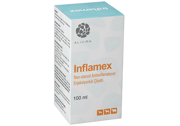 İnflamex Enjeksiyonluk Çözelti Bileşimi: Her ml’si 50 mg Fluniksin (Fluniksin meglumin şeklinde) içerir. Kullanım Sahası: Genel olarak at, sığır ve köpeklerde; Kas ve iskelet sistemi, solunum sistemi, sindirim sistemi ve ürogenital sistemin ağrılı, ateşli ve yangılı hastalıklarında; ağrı kesici, ateş düşürücü ve yangı giderici olarak kullanılır. Ticari Takdim Şekli: Karton kutu içerisinde 20 ml, 50 ml ve 100 ml’lik kahverengi cam şişelerde satışa sunulmuştur. |