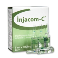 İnjacom-C Bileşimi: İnjacom-C, berrak, renksiz – açık sarı renkli enjeksiyonluk C vitamini çözeltisidir. 1 ml’sinde; 200 mg Vitamin C içerir. Farmakolojik ÖzellikleriC vitamini, bağ dokusu, kemik, kıkırdak, dentin gibi dokuların yapımı ve bütünlüğünü korumaları için gereklidir. Hücre düzeyinde oksidasyon – redüksiyon olayları ile organizmanın kalsiyum metabolizmasının düzenlenmesinde rol oynar. İç salgı bezlerinin normal çalışmalarını sağlar. Adrenal bezde glukokortikoidler ve adrenalin sentezi, oksitosin, ADH, kolesitokinin gibi hormonların metabolizmasında görev alır. Aynı zamanda kortizolun bağışıklık sistemine olumsuz etkilerini engeller. Midedeki ferri halindeki demirin ferro şekle indirgenmesini sağlayarak demirin barsaklardan emilmesini hızlandırır. Organizmanın aşırı yorgunluğunu giderici, hastalıklara ve strese neden olan her türlü dış etkene karşı direncini artırıcı etkisi vardır. Uygulama yerinden hızla emilerek geniş ölçüde vücuda yayılır. Vücutta yeterince C vitamini bulunduğunda ve kan konsantrasyonu yükseldiğinde değişmemiş olarak idrarla atılır. İnjacom-C Endikasyonları Evcil hayvanlarda başlıca skorbüt hastalığı, C vitamini eksiklikleri, anemi durumu, çeşitli kanamalar, sindirim ve solunum sistemi hastalıklarında asıl tedaviye destekleyici olarak, vücut direncinin arttırılması, çeşitli stres koşullarında ve C vitaminine olan gereksinimin arttığı durumlarda kullanılır. Kullanım Şekli ve DozuVeteriner hekim tarafından başka şekilde tavsiye edilmediği taktirde; kas içi (IM) veya damar içi (IV) yolla aşağıdaki dozlarda 5-6 gün süreyle kullanılır.