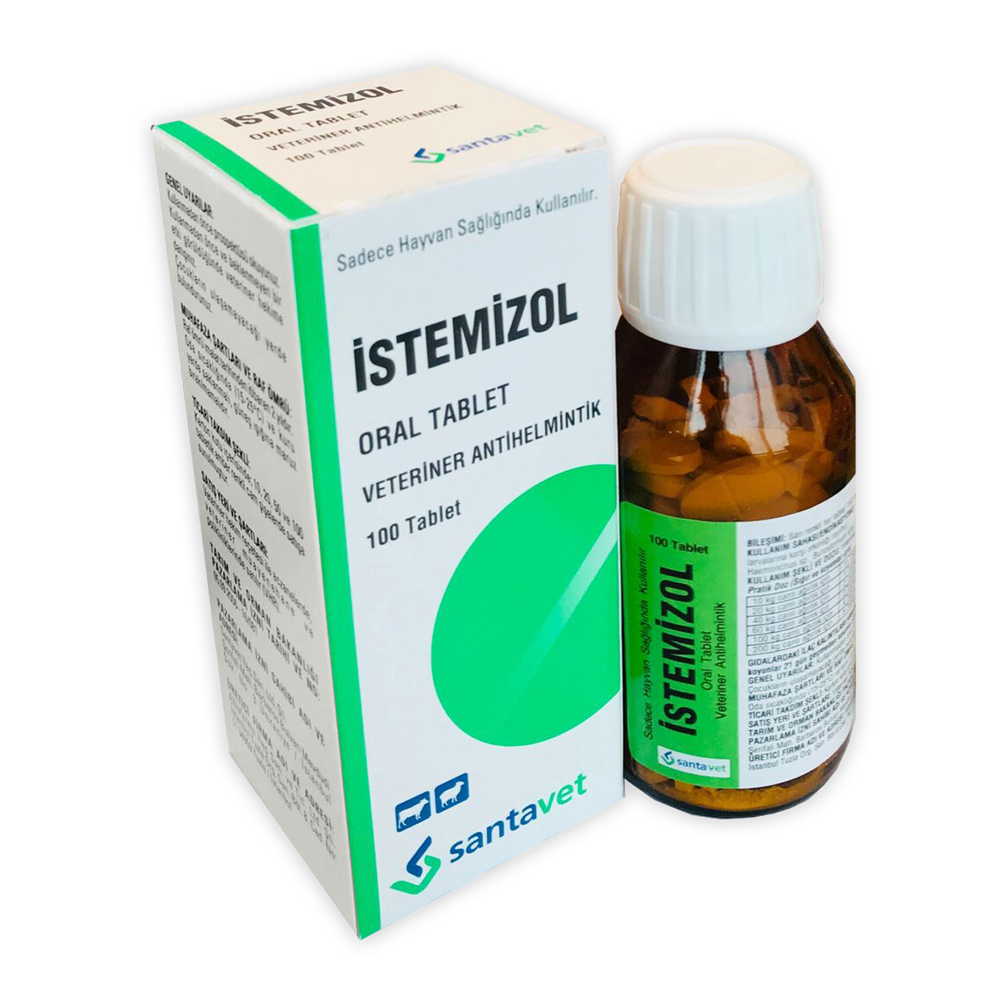 İstemizol BİLEŞİMİ: Sarı renkli her tablet 150 mg Levamizol HCI içerir. FARMAKOLOJİK ÖZELLİKLERİİstemizol Oral Tabletin etkin maddesi olan Levamizol; imidazotiyazol grubundan bir antihelmintik olup mide-bağırsak ve akciğerde bulunan nematodlara (yuvarlak kurtlar) etki eder. Etkisini parazitlerin otonomik gangliyonlarını nikotine benzer şekilde uyararak nematodları paralize (felç) etmek suretiyle gösterir. Ağız yoluyla verilen Levamizol, kolayca emilerek tüm vücuda dağılır. 1-2 saat içerisinde kan yoğunluğu en yüksek düzeye ulaşır. Oral kullanımdan sonra tüm hayvan türlerinde benzer metabolikyol izleyerek vücutta büyük ölçüde biyotransformasyona uğrar. İlk 12 saatte yaklaşık %40’ı idrarla ve ilk 48 saat içinde de yaklaşık %41’i dışkı ile atılır. KULLANIM SAHASI ve ENDİKASYONUİSTEMİZOL Oral Tablet; sığır ve koyunlarda mide-bağırsak ve akciğer kıl kurtları mücadelesinde kullanılır. Etkili olduğu parazitler: Mide-bağırsak kıl kurtları: Trichostrongylus sp.f Cooperia spp., Ostertagia sp., (Ostetagia ostertagi larvalarına karşı etkinliği zayıftır), Haemonchus sp., Bunostomum spp., Oesophagostomum sp., Chabertia ovina. Akciğer kıl kurtları: Dictyocaulus spp. İstemizol KULLANIM ŞEKLİ VE DOZUİstemizol Veteriner hekim tarafından başka şekilde tavsiye edilmediği takdirde; Pratik Doz (Sığır ve koyunlar için)