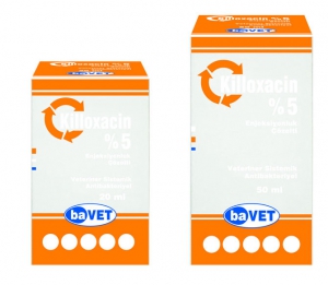 BİLEŞİMİ Her ml’sinde 50 mg Enrofloksasin içerir. KULLANIM YERİ / ENDİKASYONLARI KİLLOXACİN %5 sığır, koyun, keçi, kedi ve köpeklerde enrofloksasine duyarlı Gram negatif, Gram pozitif bakterilerle mikoplazmaların oluşturduğu enfeksiyonların tedavisinde; viral hastalıklar sırasında oluşan enrofloksasine duyarlı bakteriyel komplikasyonlarda kullanılmaktadır. UYGULAMA ŞEKLİ VE DOZU Veteriner hekim tarafından başka bir şekilde önerilmediği takdirde KİLLOXACİN % 5 Enj. Çöz.’nin tavsiye edilen farmakolojik dozu 2.5 mg/kg canlı ağırlık/gün olup pratik dozu günlük 20 kg canlı ağırlık için 1 ml‘dir. Tüm hayvanlarda kas içi (İM), deri altı (SC) veya damar içi (İV) olarak uygulanır. Tedavi üç gün boyunca devam eder. Köpek ve kedide günlük doz 5 mg/kg canlı ağırlık veya 10 kg canlı ağırlık için 1 ml Killoxacin’dir. Bu doz günde bir kez 5-7 gün boyunca deri altı yolla uygulanır. |