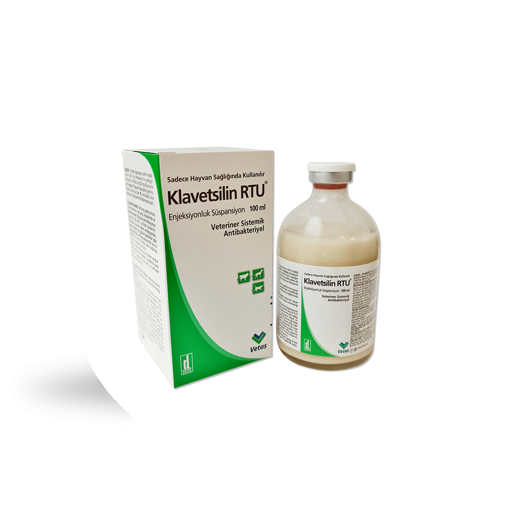Sadece Hayvan Sağlığında Kullanılır BİLEŞİMİ KLAVETSİLİN RTU Enjeksiyonluk Süspansiyon kirli krem renkli, yağlı ve steril bir süspansiyon olup beher mL’de etkin madde olarak 140,0 mg Amoksisilin’e eşdeğer Amoksisilin trihidrat ve 35,0 mg Klavulanik asit’e eşdeğer Potasyum klavulanat ve yardımcı madde olarak span 80, kolloidal silika anhidrus, fraksiyonel hindistan cevizi yağı içerir. FARMAKOLOJİK ÖZELLİKLERİ KLAVETSİLİN RTU Enjeksiyonluk Süspansiyon içerdiği amoksisilin ve klavulanik asit kombinasyonu sığır, köpek ve kedilerde bakteriyel enfeksiyonlara karşı geniş spektrumlu bakterisidal bir aktiviteye sahiptir. Amoksisilin bakteri hücre duvarındaki penisiline spesifik proteinlerine bağlanmak sureti ile hücre duvarı sentezini önler ve bakterinin lize olmasına yol açar. Amoksisilin hem Gram pozitif hem Gram negatif bakterilere etki eden beta laktam grubu bir antibiyotiktir. Bazı bakteriler tarafından oluşturulan β-laktamaz enzimi antibiyotiği bakteriye etki etmeden önce parçalayarak direnç oluşumuna neden olmaktadır. KLAVETSİLİN RTU Enjeksiyonluk Süspansiyon içinde bulunan klavulanik asit beta-laktam kimyasal yapısında, antibakteriyel aktivitesi düşük olan bir moleküldür. Bakteriler tarafından salgılanan ß-laktamaz enzimleri ile irreversibl olarak birleşerek onları etkisiz hale getirir ve bakterilerin amoksisilin’e karşı direnç geliştirmesini önler. Böylece amoksisilin hedef dokularda ulaştığı konsantrasyonlar ile duyarlı bakterilere karşı etkili olur. KLAVETSİLİN RTU Enjeksiyonluk Süspansiyon, in vitro olarak klinik olarak önemli pek çok bakteriye karşı etkilidir. Bunlar arasında aşağıdaki bakteriler sayılabilir. Gram-pozitif bakteriler: Staphylacoccus spp. (ß-laktamaz üreten suşlar dahil), Streptococus spp, Corynebacteriaceae, Clostridium spp, Bacillus anthracis, Actinomyces bovis, Peptostreptococcus spp. Gram-negatif bakteriler: Actinobacillus pleuropneumoniae, Escherichia coli (ß-laktamaz üreten suşlar dahil), Salmonella spp. (ß-laktamaz üreten suşlar dahil), Bordetella bronchiseptica, Campylobacter spp., Klebsiellae spp, Proteus spp., Pasteurellae spp., Fusobacterium necrophorum, Bacteroides spp. (ß-laktamaz üreten suşlar dahil), Haemophilus spp., Moraxella spp. ve Actinobacillus lignieresi. KLAVETSİLİN RTU Enjeksiyonluk Süspansiyon, enjeksiyon sonrası hızla emilerek serumda 1-3. saatler arasında pik konsantrasyona erişir. Böbrek, idrar, karaciğer ve safrada yüksek konsantrasyonlara ulaşır. Akciğer, deri, yağ ve kas dokusundaki konsantrasyonları ise nispeten daha düşüktür. Vücuttan başlıca idrar ve safra yoluyla atılmaktadır. KULLANIM SAHASI / ENDİKASYONLAR KLAVETSİLİN RTU Enjeksiyonluk Süspansiyon, aktivite spektrumuna giren etkenlerin sığırlarda, köpeklerde ve kedilerde neden olduğu birçok enfeksiyonun sağaltımında etkili şekilde kullanılır. Sığırlarda; solunum sistemi enfeksiyonları, abseler, eklem ve göbek hastalıkları gibi yumuşak doku enfeksiyonlarında ayrıca mastitis ve metritislerde lokal tedaviye parenteral destek amacıyla. Köpek ve kedilerde; solunum sistemi ve idrar yolu enfeksiyonları, abseler, piyoderma, anal sakulit ve gingivitis gibi deri ve yumuşak doku enfeksiyonları. KULLANIM ŞEKLİ VE DOZU Veteriner hekim tarafından başka şekilde tavsiye edilmediği takdirde; KLAVETSİLİN RTU Enjeksiyonluk Süspansiyonun sığır, köpek ve kediler için önerilen dozu 8.75 (7 mg amoksisilin ve 1.75 mg klavulanik asit) mg/kg canlı ağırlık/gün’dür. Uygulama köpek ve kedilerde kas içi ya da deri altı yolla ve sığırlarda sadece kas içi yolla yapılır. İstenen dozu elde edebilmek için 20 kg canlı ağırlığa deri altı veya kas içi yolla enjeksiyonluk süspansiyondan 1 ml uygulanmalıdır. Sağaltım günde 1 defa uygulama ile 3-5 gün devam etmelidir. İçeriğin iyi bir şekilde karışımını sağlamak üzere uygulamadan önce şişe iyice çalkalanmalıdır. Deri altı veya kas içi uygulamayı takiben enjeksiyon bölgesine masaj yapılmalıdır. Kullanımdan sonra şişede kalan süspansiyona su karışmamasına dikkat etmelidir. Bu nedenle uygulamada tamamen kuru bir enjektör kullanılmalıdır. Klavulanik asit neme karşı duyarlı olduğundan ürünün su ile temas etmemesine dikkat edilmelidir. Böyle bir durumun oluştuğu süspansiyonun renginin koyu kahveye dönüşmesi ve kabarcıkların oluşmasıyla belli olur. Bu şekilde değişime uğramış ürünün antibakteriyel etkinliği belirgin derecede azalır. Bu durumda ilaç kullanılmamalıdır. ÖZEL KLİNİK BİLGİLER VE HEDEF TÜRLER İÇİN ÖZEL UYARILAR Direnç oluşumunu önlemek için sadece amoksisilin ve klavulanik asite duyarlı patojenlerin oluşturduğu enfeksiyonların tedavisinde tedavi doz ve sürelerine uygun olarak kullanınız. Bir dozun uygulamasının unutulması durumunda çift doz uygulama yapmayınız. Gebelik ve laktasyonda kullanım: Amoksisilin ve klavulanik asit kombinasyonunun damızlık ve gebe hayvanlarda güvenliği hakkında bilgiler yoktur. Penisilinlerin plasentayı geçtiği bilinmektedir. Gebe laboratuvar hayvanları üzerinde yapılan çalışmalarda fetus üzerinde herhangi bir olumsuz etki saptanmamıştır. Bu bilgiler doğrultusunda Klavetsilin RTU Enjeksiyonluk Süspansiyon gebe hayvanlarda veteriner hekim tarafından risk/yarar değerlendirmesi yapıldıktan sonra kullanılmalıdır. Laktasyon dönemindeki hayvanlarda ilaç arınma sürelerine uyumlu olarak kullanılmalıdır. İSTENMEYEN/YAN ETKİLER Amoksisilin klavulanik asit kombinasyonu hedef türlerde iyi tolere edilir. Nadiren ilaç uygulamasından sonra lokal doku reaksiyonları (enjeksiyon bölgesinde ağrı, sertleşme, ve kızarıklık görülebilir. Penisilinler kusma, iştah kaybı, ishal gibi mide bağırsak kanalı semptomlarına neden olabilir. Penisilinler ve sefalosporinler enjeksiyon, inhalasyon ve sindirim yo