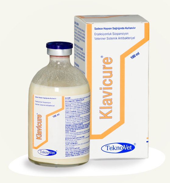 KLAVİCURE BİLEŞİMİ Krem – kirli sarı renkli, steril bir süspansiyon olan Klavicure Enjeksiyonluk Süspansiyon her ml’sinde 140 mg Amoksisilin’e eşdeğer Amoksisilin trihidrat ve 35 mg Klavulanik asite eşdeğer potasyum klavulanat içerir. FARMAKOLOJİK ÖZELLİKLERİ Klavicure Enjeksiyonluk Süspansiyon’un etkin maddesi olan Amoksisilin, bakterisidal etkili, yarı sentetik ve geniş antibakteriyel spektrumlu aminopenisilin grubu bir antibiyotiktir. Amoksisilin duyarlı mikroorganizmaların aktif bölünme safhasında hücre duvarının yapısında bulunan murein maddesinin sentezine katılan peptidoglikan zincirinin sentezinde görevli enzimleri (transpeptidaz ve DD-carboxypeptidaz) inhibe ederek, zincir sentezini engeller ve böylece hücre duvarı oluşumunu bozmak suretiyle etkisini gösterir. Bakterinin parçalanmasına yol açar, böylece duyarlı patojen bakterilerde bakterisidal etki şekillenir. Bakterinin lizisi çoğu zaman, duvarı oluşturan elementler arasındaki bağları hidrolize eden enzimlerin (otolizin, N-asetilmuramil-L-alanin amidaz ve muramidaz) aktivasyonu sonucu meydana gelir. Amoksisilin hem gram pozitif hem de gram negatif bakterilere etkinlik gösterir. Bazı bakteriler tarafından oluşturulan beta-laktamaz enzimi antibiyotiği bakteriye etki etmeden önce parçalayarak direnç oluşumuna neden olmaktadır. Diğer etkin madde olan Klavulanik asit, Strep. Clavuligerus kültürlerinden elde edilmiş, beta laktam kimyasal yapısında, tek başına antibakteriyel aktivitesi düşük olan bir moleküldür. Bakteriler tarafından salgılanan beta-laktamaz enzimleri ile irreversibl olarak birleşerek onları etkisiz hale getirir ve bakterilerin amoksisiline karşı direnç geliştirmesini önler. Böylece amoksisilin hedef dokularda ulaştığı konsantrasyonlar ile duyarlı bakterilere karşı etkili olur. Amoksisilin – klavulanik asit kombinasyonu beta-laktamaz salgılayan bakterilere karşı etkilidir. Beta-laktamazlara yarışmalı ve dönüşümsüz şekilde bağlanır ve böylece etkinliğini engeller. Amoksisilin trihidrat – klavulanik asit kombinasyonuna duyarlı bakteriler; Gram pozitif bakteriler: Staphylococcus spp. (β-laktamaz üreten suşlar dahil), Streptococcus spp., Corynebacterium spp., Clostridium spp., Bacillus anthracis, Actinomyces bovis, Peptostreptococcus spp. ve M. Tuberculosis. Gram negatif bakteriler: Actinobacillus pleuropneumoniae, Escherichia coli (β-laktamaz üreten suşlar dahil), Salmonella spp. (β-laktamaz üreten suşlar dahil), Bordetella bronchiseptica, Campylobacter spp., Klebsiella spp., Proteus spp., Pasteurella spp., Fusobacterium necrophorum, Bacteroides spp. (β-laktamaz üreten suşlar dahil), Haemophilus spp., Moraxella spp. ve Actinobacillus lignieresi. Klavicure Enjeksiyonluk Süspansiyon; uygulamayı takiben uygulama yerinden hızla emilerek 1-3 saat içinde pik plazma konsantrasyonuna ulaşır. Plazma proteinlerine düşük oranda bağlanır. Tüm vücut kesimlerine dağılır. Kan ve dokulara hızlı ve iyi bir şekilde dağılır. Vücut dokularında özellikle; akciğer, karaciğer ve böbreklerde yoğunlaşır. Vücuttan başlıca idrar ve safra yolu ile atılır. İSTENMEYEN / YAN ETKİLERİ İlacın tatbikinden sonra bazı lokal deri reaksiyonları görülebilir. Penisilinler ve sefalosporinler enjeksiyon, inhalasyon ve sindirim yoluyla alınma ve deri kontağı sonunda aşırı duyarlılığa (alerji) neden olabilirler. Penisilinlere karşı aşırı duyarlılık, sefalosporinlere karşı da aşırı duyarlılığa yol açabilir. Bunun terside mümkündür. Duyarlı hayvanlarda ürtiker, deri elzyonları, bulantı, kusma, solunum güçlüğü, akciğer ve larinks ödemi, vazomotor merkezi felç ve koma gibi alerjik, anaflaktik şok gibi yan etkiler ve ölümlere neden olabileceği de unutulmamalıdır. Anaflaktik şok durumunda epinefrin ve/veya oksijen, damar içi yolla steroid ve antihistaminikler uygulanmalıdır. İLAÇ ETKİLEŞİMLERİ Tetrasiklinler gibi bakteriostatik ilaçlarla antagonistik etkileşim nedeniyle birlikte uygulanmamalıdır. Beta laktamlar genel olarak aminoglikozidlerle sinerjist olarak etkilidirler (beta laktamlar, aminoglikozidlerin bakteri hücresine geçişini kolaylaştırarak sinerjistik bir etki oluşturur). Diüretikler amoksisilinin atılımını hızlandırdıklarından dolayı antibiyotiğin konsantrasyonunu düşürebilirler. Allopurinal gibi ürük asit sentezi inhibitörleri deri reaksiyonu oluşumu riskini arttırırlar. DOZ AŞIMINDA BELİRTİLER, TEDBİRLER VE ANTİDOT Amoksisilin ve klavulanik asitin akut ve kronik toksisitesi düşüktür. Önerilen dozlarda hedef türlerde kullanımı güvenlidir. Aşırı dozlarında gastrointestinal semptomlar ve sıvı-elektrolit dengesi bozuklukları görülebilir. Hassasiyete bağlı alerjik yan etkilerin ortaya çıkması halinde, derhal ilaç tatbikine son verilip, şekillenen klinik tabloya göre, kalp solunum analeptikleri, antihistaminikler, kortikosteroidler ve adrenalin ile sağaltıma geçilmelidir. GIDALARDA İLAÇ KALINTI UYARILARI İlaç Kalıntı Arınma Süresi (i.k.a.s.): Tedavi süresince ve son ilaç uygulamasını takiben eti için yetiştirilen sığırlar 20 gün geçmeden kesime gönderilmemelidir. Tedavi süresince ve son ilaç uygulamasını takiben 4 gün (8 sağım) süreyle elde edilen inek sütü insan tüketimine sunulmamalıdır. KONTRENDİKASYONLAR Penisilin ve sefalosporinlere alerjisi olan hayvanlarda kullanılmamalıdır. Damar içi veya perikard içi yolla kullanılmamalıdır. Gebelikte ve laktasyon döneminde kullanım: Amoksisilin ve klavulanik asit kombinasyonunun damızlık ve gebe hayvanlarda güvenliği hakkında bilgiler mevcut değildir. Penisilinlerin plasentadan geçtiği bilinmektedir. Gebe laboratuar hayvanları üzerinde yapılan çalışmalarda, fötus üzerinde herhangi bir olumsuz etki saptanmamıştır. GENEL UYARILAR Veteriner hekime danışmadan kullanmay