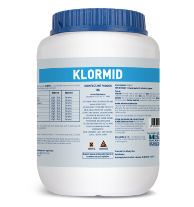 Kümes, ahır, ağıl, kafes, boks ve diğer hayvan barınakları, sağım yerleri, kuluçkahane, kesimhane, hastane ve kliniklerde yüzey dezenfeksiyonlarında, sağım makineleri, süt güğümü, süt tankları, suluklar, su deposu ve sair ekipmanların, alet malzeme ve giysilerin dezenfeksiyonunda, ellerin, memelerin, derinin dezenfeksiyonunda, hayvanların içme sularının dezenfeksiyonunda kullanılır. KLORMID, aktif klor içeren bir dezenfektandır. Suda kolay erir. Yavaş yavaş aktif klor salgılamak ve hipokloroz asit oluşturmak suretiyle jermisit etki yapar. Aktif klor atomu jerm hücrelerindeki protein ve enzimleri işlevsiz hale getirir. Gram negatif ve gram pozitif tüm bakteriler ile küf mantarları ve virüslere etkilidir. Hipokloritlere kıyasla az irkiltici ve sudaki eriyikleri daha dayanıklıdır. Asit ve nötr ortamlarda ve önceden temizlenip yıkanmış yüzeylerde etkisi en yüksektir. Kuarterner amonyum tuzları ve katyonik deterjanlarla sinerjistiktir. 500 gr, 1 kg, 5 kg, 10 kg ve 25 kg. |