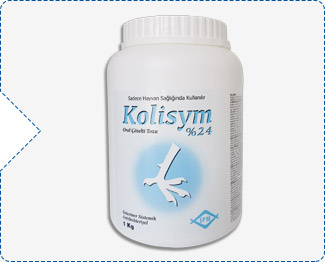 Hedef Tür: Tavuk, Buzağı, Kuzu ve Tavşan KULLANIM ŞEKLİ VE DOZU Kolistin tavuklarda günlük farmakolojik dozu 120 000 IU(6 mg) /kg ca/gün, buzağı, kuzu ve tavşanlarda 80000 IU -100000 IU (4-5 mg) /kg ca/gündür Veteriner hekim tarafından başka şekilde tavsiye edilmediği takdirde, tavuklarda 1000 kg canlı ağırlık için 25 g Kolisym %24 Oral Çözelti Tozu günlük içme suyuna eklenerek 3-4 gün içirilir.İlaçlı su her gün taze olarak hazırlanmalıdır. Buzağı, kuzu ve tavşanlarda 50 kg canlı ağırlık için 1 g toz yeterlidir. Gerekli ilaç miktarı su ile karıştırılarak içirilir. KULLANIM SAHASI