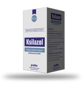 BİLEŞİMİ Her ml.si 20 mg Ksilazin (Ksilazin HCl halinde) içerir. KULLANIM SAHASI At, sığır, kedi, köpek ve vahşi hayvanlarda ; Sedatif, ağrı dindirici, hipnotik ve kas gevşetici olarak, Değişik anestezik ilaçların kullanımı öncesinde premedikasyon amacı ile kullanılır. KULLANILIŞI VE DOZU Köpeklerde : Farmakolojik doz 1-3 mg/kg canlı ağırlığa(c.a) röntgen muayeneleri, yara tedavisi, sargı değiştirme, kulak iltihabı, diş taşlarının temizlenmesi gibi aşırı ağrılı olmayan müdahaleler için. Köpeklerde diğer ilaçlarla kombinasyonu Barbituratlar ile Kas içi : 0.5-1 ml Ksilazol atropinle premedikasyonun ardından barbiturat 1/3 - 1/4 oranında azaltılmış dozda verilir. Ketamin ile 10 kg canlı ağırlık için 1 ml Ksilazol ile 60- 100 mg / 10 kg canlı ağırlık Ketamin kullanılır. Kusturucu etkiden dolayı mide bulantısı, yutak tıkanması, fıtık durumlarında kullanılmamalıdır. Akciğer hastalıklarında da dikkatli olmalıdır. Kedilerde : Farmakolojik doz 2-4 mg/kg c.a röntgen muayeneleri, yara tedavisi, sargı değiştirme, kulak iltihabı, diş taşlarının temizlenmesi gibi aşırı ağrılı olmayan müdahaleler için. Kedilerde diğer ilaçlar ile kombinasyonu: 1. Barbituratlar ile : Narkoz gerekli ise Ksilazol verilmesinden 20 dakika sonra oluşacak sedasyon halinde narkotik madde verilmesine başlanır. Premedikasyon olarak önceden atropin verilmesi faydalıdır. Ksilazol kullanıldığından Barbiturat dozu 1/3 - 1/4 oranında azaltılır, damar içi tatbikat yavaş yapılmalıdır. Eter, Halothan / Fluothan Barbituratlarla sağlanan narkozun uzatılması için eter veya Halothan ile inhalasyon ya da ıntubasyon narkozu güvenli ve etkili uygulamadır. Ketamin ile : Ksilazol 0.1 ml/kg canlı ağırlık ve Ketamin 5-15 mg/kg canlı ağırlık birlikte kullanılabilir. Sığırlarda : Farmakolojik doz kas içi 0.05-0.2 mg/ kg canlı ağırlık; damar içi 0.016 -0.1 mg/kg c.a Atlarda : Farmakolojik doz damar içi 0.8 mg/kg c.a., kas içi 1.5-3 mg/kg c.a. At ve sığırlarda diğer ilaçlarla kombinasyonu: Çok daha ağrılı ve zor cerrahi operasyonlarda şu kombinasyonlar kullanılabilir. Kloralhidrat Damar içi 4 ml/100 kg canlı ağırlık için Ksilazol ve 8 gr kloralhidrat Barbituratlar ile Damar içi yolla 5 ml /100 kg canlı ağırlık Ksilazol ve 6-8 mg/kg pentbarbital veya tiyopental