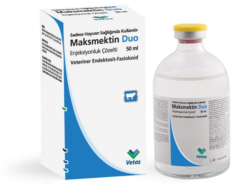 BİLEŞİMİ KULLANIM SAHASI/ENDİKASYONLAR Karaciğer distomları: Fasciola hepatica (ergin), Fasciola gigantica (ergin). KULLANIM ŞEKLİ VE DOZU İvermektinin farmakolojik dozu 0,2 mg/kg canlı ağırlık ve klorsulonun ise, 2 mg/kg canlı ağırlıktır. Pratik olarak her 50 kg canlı ağırlığa 1 ml MAKSMEKTİN DUO Enjeksiyonluk Çözelti olacak şekilde sadece deri altı yolla uygulanır. Canlı ağırlık esasına göre, pratik doz tablosu aşağıdaki gibidir : Canlı ağırlık Miktar Canlı ağırlık Miktar 50 kg 1 ml 300 kg 6 ml 100 kg 2 ml 400 kg 8 ml 200 kg 4 ml 500 kg 10 ml Damar içi veya kas içine uygulanmamalıdır. Enjeksiyon bölgesinde oluşabilecek enfeksiyonların önüne geçmek için uygulama esnasında asepsi ve antisepsi kurallarına özen gösterilmelidir. Enjeksiyon bölgesinde oluşabilecek ağrı, şişlik gibi reaksiyonları önlemek için 10 ml üzerindeki dozlar ikiye bölünerek uygulanmalıdır. |