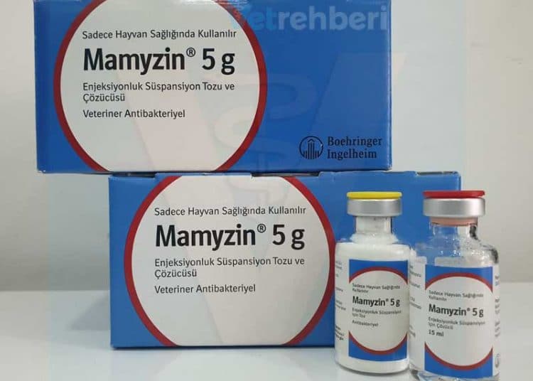 Mamyzin 10 g Bileşimi: Mamyzin® 10 g Enjeksiyonluk Süspansiyon Tozu ve Çözücüsünün bileşimi şu şekildedir: 10 gram toz içeren her flakonda 10 milyon İ.Ü. penetamat hidriodid bulunur. 30 ml’lik sulandırıcı flakonu koruyucu olarak 1,5 mg/ml metil parahidroksibenzoat içerir. Süspansiyon haline getirilmiş ürünün her ml’sinde 333,3 mg (0,333 İ.Ü.) penetamat hidriodid bulunur. Farmakolojik Özellikleri Mamyzin Bir β-laktam olan penetamat hidriodid benzilpenisilinin bir ön maddesidir. Benzilpenisilin (Penisilin G) penetamatın plazma ve dokularda hidrolizi sonucu oluşur ve antimikrobiyal özelliğe sahip olan maddedir. β -laktam antibiyotiklerin primer farmakodinamik etkisi bakterilerde, çoğunlukla da Gram pozitif bakterilerde hücre duvarı sentezinin inhibe edilmesidir. Bakterisit antibiyotiklerdir ve etkileri süreye bağlıdır. Benzilpenisilin dar spektrumlu bir antibiyotiktir ve Gram pozitif mikroorganizmalara (örneğin betalaktamaz üretmeyen Staphylococcus aureus ile Streptococcus agalactiae, Streptococcus dysgalactiae, Streptococcus uberis) etkilidir. Betalaktamaz üreten stafilokoklar ise benzilpenisiline dirençlidir. Yine mastitten sorumlu Gram negatif enterokoklar (örneğin E.coli) benzilpenisiline duyarlı değildir. Benzilpenisilinin plazma proteinlerine bağlanma oranı yaklaşık %48’dir. Ayrıca, penetamatın meme epitel hücrelerine penetre olarak, hücre içinde yaşayan Str. uberis gibi organizmaları öldürdüğü de gösterilmiştir. Yine, düvelerde, doğum öncesinde 12,3-14,3 mg/kg dozunda bir kez penetamat hidriodid uygulamasından 24 saat sonrasında meme dokusunda yüksek benzilpenisilin konsantrasyonlarına ulaşıldığı görülmüştür. Benzilpenisilin ağırlıklı olarak böbrekler yoluyla atılır. Mamyzin Endikasyonlar Mamyzin 10 g Enjeksiyonluk Süspansiyon Tozu ve Çözücüsü, süt sığırlarında streptokoklar ve β-laktamaz oluşturmayan stafilokokların ve penisiline duyarlı diğer hastalık etkenlerinin neden olduğu mastitlerin tedavisinde kullanılır. Mamyzin Kullanım Şekli ve DozuMamyzin 10 g Toz, beraberindeki sulandırıcı ile sulandırıldıktan sonra sığırlarda kas içi yolla enjeksiyon şeklinde kullanılır. Sulandırma: Flakonun içeriğinin tamamı 30 ml’lik sulandırıcıyla sulandırılıp süspansiyon haline getirilir. Penetamatın farmakolojik dozu günlük 10-15 mg/kg canlı ağırlıktır. Veteriner Hekim tarafından başka şekilde tavsiye edilmediği takdirde; Günde 10 mg/kg (10000 İ.Ü./kg) canlı ağırlık dozunda penetamat hidriodid uygulanır (500 kg canlı ağırlık için 5 g penetamat hidriodid). Pratik olarak, her 100 kg canlı ağırlık için sulandırılmış üründen 3 ml uygulanır. Sulandırılmış flakonun içeriği 500 kg’lık bir süt sığırına iki uygulama için yeterlidir. Uygulamaya 24 saat aralıklarla 4 gün devam edilebilir. Üç gün içerisinde tedavi olmayan vakalarda teşhis yeniden gözden geçirilmeli; gerekirse, tedavi değiştirilmelidir. Kullanmadan önce iyice çalkalayınız. Yalnızca kas içi kullanım içindir. Damar içi yolla uygulamayınız. Özel Klinik Bilgiler ve HedefTürler İçin Özel Uyarılar Mamyzin İlacın kullanımı esasen bir antibiyogram ve de yerel, resmi, bilinen antibiyotik uygulama yönergeleri dikkate alınarak yapılmalıdır. Penetamat hidriodid kullanımında benzilpenisiline karşı alerji riski göz önünde bulundurulmalıdır. Gebelik ve Laktasyonda Kullanımı: İlaç, laktasyon döneminde ve gebelikte kullanılabilir. İstenmeyen / Yan Etkiler Deri reaksiyonları gibi alerjik reaksiyonlar ya da anafilaksi görülebilir. Bunlar, bazı durumlarda ölüme neden olabilir. Penisiline karşı duyarlılık gelişebilir. Aşırı duyarlılık gelişimi halinde uygulama durdurulmalıdır. Prospektüste belirtilenin dışında başka bir yan etki görüldüğünde veteriner hekime başvurunuz. İlaç EtkileşimleriMamyzin Kimyasal ve fiziksel etkileşimlerden dolayı aynı enjektörde başka bir ilaçla karıştırılmamalıdır. Bakteriyostatik antibiyotiklerle birlikte uygulanmamalıdır. Doz Aşımında Belirtiler,Tedbirler ve Antidot Doz aşımında hem alerjik reaksiyonlar, hem de merkezi venöz tepkiler (titreme, salivasyon, kramp, vb.) görülebilir. Bu gibi durumlarda uygulama hemen durdurulmalıdır. Doz aşımı belirtilerinde semptomatik tedavi uygulanır (anafilakside epinefrin, prednizolon, sıvı takviyesi; diğer alerjik reaksiyonlarda prednizolon). Gıdalarda İlaç Kalıntı Uyarıları İlaç Kalıntı Arınma Süresi (i.k.a.s.):Tedavi süresince ve son ilaç uygulamasından sonra, eti için yetiştirilen sığırlar 14 gün geçmeden kesime gönderilmemelidir. İlaç kullanımı süresince ve kullanımın durdurulmasını takiben 4 gün (8 sağım) süreyle elde edilen sütler tüketime sunulmamalıdır. Kontrendikasyonlar Penisiline karşı direnç gelişimi, β-laktamaz oluşturan hastalık etkenleriyle enfeksiyon, penisilin ve sefalosporinlere karşı alerji, anüri ve oligoüri ile seyreden ağır böbrek fonksiyonu yetmezlikleri, ilaca ya da bileşenlerinden birine karşı bilinen aşırı hassasiyet durumunda kullanılmamalıdır. Bakteriyostatik antibiyotiklerle birlikte uygulanmamalıdır. Damar içi yolla kullanılmamalıdır. Genel UyarılarKullanmadan önce ve beklenmeyen bir etki görüldüğünde veteriner hekime danışınız. Çocukların ulaşamayacağı yerde bulundurunuz. Uygulayıcının Alması Gereken Önlemler ve Beşeri Hekimler İçin Uyarılar Penisilinler ve sefalosporinler enjeksiyon, inhalasyon, yutma ya da deriyle temas sonrasında hipersensitiviteye (alerji) neden olabilir. Hipersensitivite yönünden penisilinler ve sefalosporinler arasında karşılıklı ilişki söz konusudur. Bu maddelere karşı bilinen bir hassasiyet durumunda bu maddelerle temas etmeyiniz. Ürünü, gerekli tüm önlemleri aldıktan sonra dikkatli bir şekilde tutunuz. Temas sonrasında d