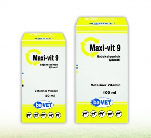BİLEŞİMİ MAXİ-VİT 9 Enjeksiyonluk Çözelti; berrak sarı renkli enjeksiyonluk çözelti halinde olup her ml’sinde; Vitamin A 15.000 IU KULLANIM YERİ / ENDİKASYONLAR MAXİ-VİT 9 Enjeksiyonluk Çözelti sığır, koyun, keçi ve atlarda formülasyonundaki vitaminlerin eksikliklerinin giderilmesinde ve bu vitaminlerin avitaminozislerine bağlı hastalıkların tedavisinde; besi içeriğindeki vitaminlerden (özellikle Vit. D) eksikliğinden kaynaklanan genç hayvanlarda raşitizm, erginlerde osteomalazi gibi hastalıkların tedavisinde, ruminal aktivitenin başlamadığı kuzu, oğlak ve buzağılarda vitamin ihtiyacının karşılanmasında kullanılır. UYGULAMA ŞEKLİ VE DOZU Veteriner Hekim tarafından başka şekilde tavsiye edilmediği takdirde: deri altı ve kas içi enjeksiyon şeklinde belirtilen dozlarda uygulanır. At ve sığırlara 20–30 ml |