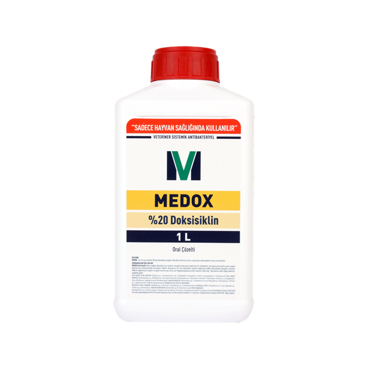 Bileşimi: Farmakolojik Özellikleri: Gram-pozitif aerob bakteriler (Bacillus sp.,Corynebacterium sp., Erysipelothrixrhusiopathia, Listeriamono cytogenes ve Streptococci), Gram negatif bakteriler (Actinobacillus sp., Bordetella sp., Francisellatularensis, Haemophilus sp., Pasteurellamultocida, P. haemolytica, Yersinia sp., Campylobacterfetus, Borrelia sp., Leptospira sp. ve Moraxellabovis), anaerob bakteriler (Actinomyces sp.,Fusobacterium sp.) ve Mycoplasma, Chlamydia sp., Ehrlichia sp., Coxiellaburnetti, Theileria, Eperythrozoon ve Anaplasma’lara etkisi iyi derecededir. Kazanılmış direnç nedeniyle Staphylococci, Enterococci, Enterobacter sp.,Enterobacteriaceae familyasına dahil Enterobacter sp., E.coli, Klepsiella sp., Proteus sp., Salmonella sp., Anaerob bakterilerden Bacteroides sp. Ve Clostridiumsp.’ye etkisi değişkendir. Mycobacterium sp.,Proteus vulgaris, Pseudomonas aeroginosa, Serratia sp., Mycoplasma bovisve M. Hyopneumoniae tetrasiklinlere dirençli kabul edilir. Oral yolla uygulandığında etkili kan konsantrasyonuna ulaşır ve etkin düzeyini ortalama 6-12 saat korur. Biyoyararlanımı ortalama %80-90’dır. Yağ/su dağılım katsayısı yüksek olduğundan vücutta çok geniş bir dağılım gösterir. Doksisiklin renal klirensi en düşük ve biyolojik yarı ömrü en uzun tetrasiklin türevi olup, mikrobiyolojik olarak inaktif formda dışkı ile atılır. Safra içinde plazmadakinden 5-10 kez daha yüksek yoğunluklarda birikir. Safra ile bağırsaklara atılan doksisiklinin bir kısmı geri emilerek enterohepatik dolaşıma katılır. Endikasyonları: Buzağı:Colibacillosis, Colisepticemia, Chlamydiasis, Pasteurellosis, diğer solunum ve sindirim sistemi enfeksiyonları, omphalitis, poliarthiritis Tavuk ve Hindi:Mycoplasma sp.,Staphylococcusaureus, Streptococcus sp., E.coli, Salmonella sp., Chlamydia sp., Haemophilus sp. vePasteurella sp. Uygulama Şekli ve Dozu: Tavuk ve hindilerde,10-20 mg/kg canlı ağırlık/gün dozunda, pratik olarak her 1000 kg canlı ağırlık için günde 50-100ml MEDOX kullanılır. Gerekli olan miktar hayvanların günlük içme sularına karıştırılarak kullanılır. İlaçlı suyun uygulanmasından 2-3 saat kadar önce hayvanların susuz bırakılması tavsiye edilir. İlaçlı su her gün taze olarak yeniden hazırlanmalıdır. Tedaviye 3-5 gün devam edilir. |