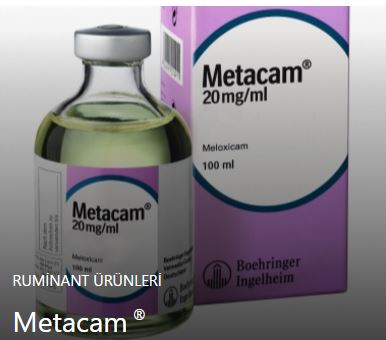 Metacam 20mg/ml Bileşimi: Metacam 20 mg/ml Enjeksiyonluk Çözelti; steril, sarı renkli ve berrak bir enjeksiyonluk çözeltidir, her ml’sinde 20 mg meloksikam ve koruyucu madde olarak etanol içerir. Farmakolojik Özellikleri Meloksikam, prostaglandin sentezini inhibe eden ve bu yolla antiinflamatuvar, antieksudatif, analjezik ve antipiretik etkiler gösteren oksikam sınıfında yer alan steroid olmayan antiinflamatuvar bir ilaçtır (NSAID). Sığırlarda E. coli toksini tarafından oluşturulan tromboksan B2 sentezini inhibe ederek anti-endotoksik özellikler gösterir. İnflamasyonlu dokuya lökosit infiltrasyonunu azaltır. 0,5 mg meloksikam/kg dozunda yapılan tek doz deri altı uygulama sonrası danalarda maksimum plazma konsantrasyonu (Cmax) olan 2,1 µg/ml değerine 7,7 saat sonra, ineklerde ise maksimum plazma konsantrasyonu olan 2,7 µg/ml değerine 4 saat sonra ulaşır. Meloksikamın %98’den fazlası plazma proteinlerine bağlanır. En yüksek konsantrasyonlara karaciğer ve böbrekte ulaşır. İskelet kasında ve yağ dokudaki konsantrasyonu ise nispeten daha düşüktür. Meloksikam ağırlıklı olarak plazmada bulunur. Sığırlarda ağırlıklı olarak süt ve safra ile atılır, idrarda ise sadece ana bileşiğin kalıntılarına rastlanır. Meloksikam karaciğerde oksidasyonla metabolize olur, metabolitler farmakolojik olarak inaktiftirler. Meloksikamın danalarda deri altı enjeksiyon sonrası atılım yarı ömrü 26 saat, ineklerde 17,5 saattir. Atlarda damar içi enjeksiyonun ardından atılım yarı ömrü ise 8,5 saattir. Uygulanan dozun yaklaşık %50’si idrarla, kalan kısım ise dışkıyla atılmaktadır. Hedef Türler Sığır ve atlarda kullanıma yöneliktir. Metacam EndikasyonlarıMetacam 20 mg/ml Enjeksiyonluk Çözelti aşağıdaki durumlarda kullanılır: Sığırlar: