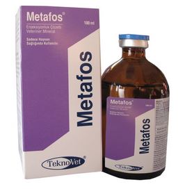 BİLEŞİMİ 1 ml’de 200 mg Toldimfos sodyum içerir. Etken maddenin organik olarak bağlanmış fosfor oranı %14’tür. KULLANIM YERİ /ENDİKASYONLARI Metafos Enjeksiyonluk Çözelti; sığır, at, koyun, keçi, kedi ve köpeklerde karşılaşılan başlıca fosfor eksiklikleri ve buna bağlı olarak gelişen osteomalasi ve raşitizm olguları, sinir sistemi bozuklukları, kasiyum-fosfor dengesi bozuklukları, genel düşkünlük halleri ve ruminantlarda sıklıkla karşılaşılan hipofosfatemi olgularının sağaltımında kullanılır. Hızlı gelişme ve büyüme dönemindeki gençler ile yüksek verimli hayvanlarda çok yönlü fosfor gelişmesinin karşılanması amacıyla, özellikle süt inekleri ve aşırı fosfor atımı gerçekleşen hastalık hallerinde karşılaşılan hipofosfatemi olgularında, ayrıca, genel durumu desteklemek amacıyla, döl verimi bozukluklarında, nekahat hallerinde, kalsiyum ve magnezyum metabolizması bozukluklarında kullanılan etkili bir fosfor kaynağıdır. KULLANIM ŞEKLİ VE DOZU Metafos Enjeksiyonluk Çözelti, tüm hayvan türlerinde derin kas içi (İM), ven içi (İV) veya deri altı (SC) yolla 10 mg/kg c.a. şeklinde uygulanır. Veteriner Hekim tarafından başka şekilde tavsiye edilmediği taktirde pratik dozlar şöyledir;
