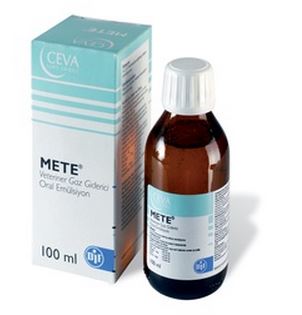 BİLEŞİMİ METE, sarı renkte akıcı emülsiyon olup; %2.5 Dimetil polisiloksan (Silikon) içerir. ENDİKASYONLARI Sığır, koyun, keçi ve atlarda akut ve kronik meteorismuslarda (köpüklü gazlı şişkinliklerde), kuzu, buzağı ve oğlak septisemilerinde görülen rumen şişkinliklerinde kullanılır. Korunma için Hipnotik ve narkotik ilaçların kullanılmasından evvel, meraya veya hasattan sonra ekin tarlasına çıkarılmadan önce, meydana gelebilecek rumenin köpüklü ve köpüksüz şişkinliklerini önlemek amacıyla koruyucu olarak kullanılır. KULLANIM ŞEKLİ VE DOZU METE, oral veya rumen içi yolla kullanılır. Oral yol: METE, 5-10 misli ılık su ile sulandırılıp geviş getirenlerde şişe ile içirilerek, tek tırnaklarda ise burun meri sondasıyla verilir. Rumen içi: Acil durumlarda asepsi ve antisepsiye dikkat edilerek, ruminantlarda sol fossa paralumbalisten rumene, atlarda sağ fossa paralumbalisten sekuma uygun bir trokar ile girilir. Önce gaz çıkartılır, sonra METE sulandırılmadan trokar kanalından içeriye enjekte edilir. Veteriner hekim tarafından başka şekilde tavsiye edilmediği takdirde aşağıdaki dozlarda kullanılır: Sığır - At : 50-75 ml Genellikle tek uygulama yeterlidir. |