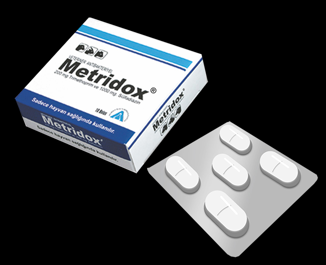 FARMAKOLOJİK ÖZELLİKLERİ Metridox tablet, geniş antibakteriyel etkisi olan sülfadiazin ve trimetoprim kombinasyonu esasına dayanan güçlendirilmiş sülfanamid kombinasyonu olup, ağızdan ve uterus içi yollardan kullanılmaya özgü bir bolus formülasyonudur. Mikroorganizmalarda folinik asit biyosentezinin birbirini izleyen safhalarını katalize eden iki enzimi sinerjik olarak bloke eden iki aktif ajan içerir. Bu aktif ajanların tek başlarına bakteriyostatik oldukları konsantrasyonlarda iki aktif ajan bir arada bulunmaları halinde bu mekanizma invitro bakterisid bir etki haline dönüşür. Kombinasyona duyarlı başlıca bakteriler şunlardır; Gram pozitif aeroblar: Staph. aeureus, Streptococcus sp., Corynebacterium sp., Listeria monocytogenes, Erysipelothrix rhusiopathie, Gram negatif aeroblar: Actinobacillus sp., Bordetalla sp., Enterobacteriaceae (E.coli, Klebsiella sp., Proteus sp., Salmonella sp., Yersinia sp.), Haemophilussp., Pasteurella sp., Aneeroblar: Actimomyces sp., Bacteroides sp., Fusobacterium sp., bazı Clostridium sp., Chlamydia sp.. Bazı Mycobacterium sp. ve bazı Nocardia sp. orta derecede duyarlıdır. Rickettsia sp., Leptospira sp., Pseudomanas aeroginosa, Mycoplasma sp. dirençli olarak kabul edilir, ilaç verildikten bir gün sonra bile kanda tespit edilebilir seviyededir. Her iki aktif ajan da kanda serbest halde ve metabolize edilmiş formları şeklinde bulunur. Yaklaşık olarak Trimethoprimin %44' ü, Sülfadiazinin %70' i kan proteinlerine bağlı olarak seyreder. Her iki aktif ajanın kandaki yarı ömürleri 8 ila 10 saattir. Atılım böbrekler yolu ile olur. idrardaki konsantrasyonu kandaki konsantrasyonundan fazladır. Her iki aktif ajan da balgama, vajinal sıvıya, orta kulak sıvısına ve bronş salgısına geçer. Plasenta bariyerini geçip, süt ile atılır. DOZ AŞIMINDA BELİRTİLER, TEDBİRLER VE ANTİDOT Trimetoprim + sülfonamid türevleri esasına dayanan bütün kombinasyonların çiftlik hayvanlarındaki toksisitesi oldukça düşüktür. Buna rağmen önerilen dozlar aşılmamalı ve 5 günden uzun süre kullanılmamalıdır. Doz aşımı hallerinde tedavi semptomatiktir. Diürezi sağlamak, dolayısıyla da ilacın idrardan eliminasyonuna yardım etmek için sıvı tedavisi uygulanmalıdır. Sodyum bikarbonat verilerek kristalüri riski en aza indirilebilir. Nadir olmakla beraber anafilaktik reaksiyonların görülmesi durumunda epinefrin uygulanmalıdır. |