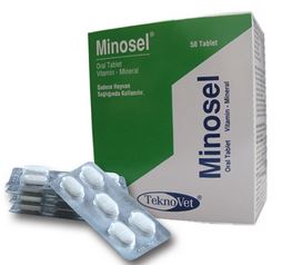 MİNOSEL BİLEŞİMİ Açık eflatun veya eflatun renkli, ortası çentikli her tablet ; Alfatokoferol asetat (Vitamin E) 500 mcg FARMAKOLOJİK ÖZELLİKLERİ Alfatokoferol asetat (Vitamin E) ; Doymamış yağ asitlerinin yükseltgenmesini önleyerek hücre zarlarının dayanıklılığını artırır. Kas dejenerasyonunun ve hepatik nekrozun önlenmesinde de önem taşır.Seksüel fizyolojide gonadotropin üretimi, testis fonksiyonlarının düzenlenmesi ve fötusun gelişmesinde rol almaktadır. Vitamin E, oral yolla verildikten sonra önce lenf dolaşımına, sonra da kan dolaşımına girer ve lipoproteinlere bağlı halde taşınır.Tüm dokulara dağılır. Karaciğer ve kalp dokusunda daha yoğun miktarlarda bulunur. Kullanılmayan Vitamin E büyük oranda vücut yağ dokularında depolanır. Uygulamadan sonra bir hafta içerisinde büyük çoğunluğu safra ile atılır. Selenyum ; Hücre yapısında ve membranlarda koruyucu görevi olan glutatyon peroksidaz enziminin yapısında bulunur. Selenyum eksikliği halinde bu koruma ortadan kalkar ve öncelikle kas lifleri fonksiyonlarını kaybetmeye başlar. Ağız yolu ile verilen Selenyum barsakların üst kısmından kolayca emilir.Emildikten yaklaşık 2-4 saat sonra bütün vücuda dağılır.Yarı ömrü yaklaşık 3 gün sürer. Başlıca proteinlere bağlanmış halde en fazla böbrek, karaciğer, dalak ve daha düşük yoğunluklarda da beyin, kaslar ve eritrositlerde birikir. Emilen Selenyum’un fazlası böbreklerle ve bir kısmı da dışkı ve solunum havası ile atılır. Bakır ; Organizmanın birçok enzimatik faaliyetinde koenzim olarak veya aktivatör halinde rol alan bir iz elementtir. Kanın şekillenmesi, bağ doku metabolizması, yeni doğanlarda miyelinin oluşması, kemik matrikslerinin şekillenmesi, deri veya kıl renginin oluşmasına doğrudan etkilidir. Tüm hücrelerde bulunan bakırlı proteinler (kupreinler) süperoksit dismutaz etkinliği gösterir. Bu oksijenin zararlı etkilerine karşı dokuları korur. Bakır ağızdan verildikten sonra sindirim kanalından çok sınırlı olarak emilir;Dolaşıma geçen Bakır karaciğer tarafından tutulur ve bazı doku proteinlerine bağlanır. Plazmada bulunan Bakır’ın çoğu seruloplazmin olarak bilinen bir alfa-globulin oksidaz şeklindedir. Uygulamadan 4 saat sonra en yüksek plazma seviyelerine çıkan Bakır ruminantlarda daha çok karaciğerde yoğunlaşır. Bakır’ın yaklaşık %90’ı dışkı ile atılırken, geri kalanı da idrar ,süt ve deri yolu ile atılır. Kobalt ; Siyanokobalamin molekülünün merkezi atomudur.Özellikle anemi ve sinir sisteminin dengesi yönünden önem taşır.Alyuvar yapımında ve enzimatik işlemlerde görev alan Kobalt hayvanların aşırı parazit invazyonlarından korunmasında da etkilidir. Ağız yolu ile verildikten sonra sindirim kanalından kolayca emilir. Vücutta başlıca karaciğer ve böbrekler olmak üzere, bütün dokulara dağılır. Başlıca İdrar ve safra yolu ile atılır. Çinko ; Normal hücre bölünmesinde, protein sentezinde ve genital fonksiyonlarda enzimatik reaksiyonlara katılarak görev alır. Çinko desteği hayvanlarda yaraların daha çabuk iyileşmesine ve bağışıklığın gelişmesine katkı sağlamaktadır.Özellikle ayaklarda ve tırnaklarda görülen bozuklukların azalmasında Çinko verilmesinin önemi vardır.Çinko ağızdan verildikten sonra sindirim kanalından çok az emilir. Dolaşıma geçen Çinko tüm vücuda dağılır. Özellikle karaciğer, böbrek korteksi, kas, kıl, erkek üreme organları, tapedum lusidum ve pankreas salgısında yüksek yoğunluklarda bulunur. Metabolize olan Çinko tuzları deri, tırnak, kıl, dışkı ve idrar yolu ile atılır. Trikalsiyum fosfat ; Sinirsel uyarının geçişi, kasların kasılması, hücre içi haberleşmenin sağlanması, adenozin trifosfataz’ın etkinleştirilmesi, vücudun tampon sistemlerinde ve kanın pıhtılaşmasında rol oynar. Ağız yolu ile verildikten sonra sindirim sisteminin başlıca üst kısımlarından emilir. Vücutta kalsiyum’un çok önemli bir kısmı (%99) kemik ve dişlerde bulunur. Kalsiyum plazmada hücrelerdekine göre daha yüksek yoğunlukta bulunur. Kalsiyum yaklaşık %90 idrarla ve bunun yanı sıra az bir kısım da dışkı ile atılır. Çok küçük miktarlarda da ter, deri, kıl ve tırnaklar ile atılır. ÖZEL KLİNİK BİLGİLER VE HEDEF TÜRLER İÇİN ÖZEL UYARILAR Yüksek dozlarda, Selenyum’un toksik etkiye neden olabileceği dikkate alınarak doz ayarlaması dikkatli yapılmalıdır. Bakıra en duyarlı hayvan türü koyundur; toprağında yüksek düzeyde bakır bulunan bölgelerdeki koyunlarda kronik nitelikli bakır zehirlenmesi kaçınılmazdır. İSTENMEYEN / YAN ETKİLERİ Önerilen dozlarda bilinen bir yan etkisi yoktur. İLAÇ ETKİLEŞİMLERİ İçerdiği mineral maddelerin sindirim sisteminde diğer organik maddelere bağlanma eğilimi nedeniyle diğer ilaçlarla birlikte verilmemesi önerilir. DOZ AŞIMINDA BELİRTİLER , TEDBİRLER VE ANTİDOT Doz aşımında Selenyum toksisitesine bağlı akut toksikasyon belirtileri gözlenir. Böyle bir durumda atropin ile müdahale edilir. Bakır sülfat kuzularda 25-50 mg / kg, koyunlarda 130 mg / kg ve ineklerde 200 mg / kg dozda akut zehirlenmeye yol açar.Etkilenen hayvanlarda bulantı, kusma, ishal ve taşikardi gibi belirtiler gözlenir. Akut zehirlenme durumunda sindirim sisteminin hızla boşaltılması sağlanır. Sindirim sisteminde emilmemiş bakır’a karşı antidot olarak magnezyum oksit, kükürt ve potasyum ferrosiyanür uygulanır. Bakır zehirliliğinde alyuvarların parçalanması, sarılık, karaciğer nekrozu ve böbrek yetmezliğine ilişkin belirtiler ortaya çıkar. Kobalt elementtinde doz aşımı hallerinde iştahta azalma ,zayıflık ve kansızlık oluşabilir. GIDALARDA İLAÇ KALINTI UYARILARI İlaç Kalıntı Arınma Süresi (İ.K.A.S.) ; Tedavi süresince ve son ilaç uygulamasını 