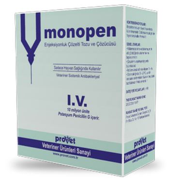 MONOPEN BİLEŞİMİ Her flakon beyaz, steril, suda çözünür toz halde 10 milyon ünite Potasyum Penisilin G içerir. Sulandırıcı ile sulandırılınca yaklaşık 25 ml berrak çözelti elde edilir. Elde edilen çözeltinin her ml.sinde 400.000 i.ü etkin madde bulunur. FARMAKOLOJIK ÖZELLIKLERI Penisilin G duyarlı mikroorganizmaların aktif üreme devrelerinde bakterisit etkili olan dar spektrumlu bir antibiyotiktir. Hücre duvarı mukopeptidinin biyosentezini inhibe ederek etki gösterir. Birçok stafilokok suşunun dahil olduğu penisilinaz üreten bakterilere karşı etkili değildir . Penisilin G stafilokoklara ( penisilinaz üreten suşlar hariç), streptokoklara ve pneumokoklara invitro olarak çok etkilidir. Bacillus antracis, Clostridium spp, Actinomyces bovis, Listeria spp ve Leptospiralara karşı da in vitro yüksek etkinlik gösterir. Penisilin G kasiçi ve derialtı uygulamadan sonra hızla emilir.Verilen total dozun %60 kadarı 5 saatlik süre içinde değişimemiş halde idrarla atılır. ÖZEL KLİNİK BİLGİLER Ciddi enfeksiyonların tedavisinde istenen yüksek serum seviyelerini sürdürmek için yüksek ve sık dozlar gereklidir. Gebelikte kullanımı : PenisilinG önerilen dozlarda gebelik yönünden güvenlidir. DİĞER İLAÇLARLA ETKİLEŞİM Tetrasiklinler ile aynı anda verilmemelidir YAN ETKİLER Penisilinlerin en önemli yan etkılerı akut anafılaksı ve kollapstır. Ayrıca daha az şiddette ama daha sıklıkla aşırı duyarlılık reaksiyonları (ürtıker, ateş, anjıonörotık ödem gibi) görülebilir. Anafılaksı oluşursa epınefrın ve/veya oksijen, İ.V steroıd uygulanmalıdır. DOZ AŞIMINDA BELİRTİLER VE ÖNLEMLER Verilen dozun ve sürenin uzamasına bağlı olarak ototoksik ve nefrotoksik etkiler oluşabilir GIDALARDA İLAÇ KALINTI UYARILARI İlaç kalıntı Arınma Süresi(i.k.a.s): Tedavi süresince ve son ilaç uygulamasını takip eden 10 gün süreyle sığır, koyun ve keçiler kesime gönderilmemeli, son ilaç uygulamasınından sonra 4 gün boyunca elde edilen koyun, keçi ve inek sütleri insan gıdası olarak kullanılmamalıdır. KONTRENDİKASYONLARI Penisilin ve türevlerine aşırı duyarlı hayvanlarda kullanılmamalıdır. Ciddi renal bozukluğu olan hayvanlarda kullanılmamalıdır. Küçük herbivorlarda ve perde ayaklılarda kullanılmamalıdır. GENEL UYARILAR Kullanmadan önce ve beklenmeyen bir etki görüldüğünde veteriner hekime başvurulmalıdır. Çocukların ulaşamayacağı yerde bulundurunuz. SAKLANMASI VE RAF ÖMRÜ Raf ömrü imalat tarihinden itibaren 2 yıldır. Oda sıcaklığında (15-25 C ), ışıktan korunarak saklanmalıdır. Sulandırıldıktan sonra oda ısısında 24 saat içinde , buzdolabında saklanırsa 1 hafta içinde kullanılmalıdır. TICARI TAKDIM ŞEKLI Toz içeren (10 milyon ünite) 50 ml'lik renksiz cam flakonlar 20 ml çözücü içeren renksiz cam flakonlarla birlikte karton kutularda. |