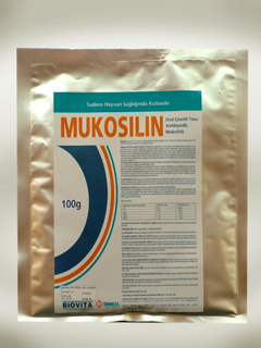 MUKOSİLİN BİLEŞİMİ Beyaz renkli ince bir toz olan 100 g mukosilin; 14 g amoksisilin trihidrat ve 0.5 g bromheksin hidroklorür içerir. (%14 amoksisilin trihidrata eşdeğer %12.19 amoksisilin baz içerir) KULLANIM SAHASI/ENDİKASYONLARI Mukosilin, etçi tavuk ve hindilerde, amoksisiline duyarlı bakterilerin meydana getirdiği Kolibasillozis, pullorum, tifo, paratifo, enfeksiyöz koriza, listeriozis, klostridiyal enfeksiyonlar başta olmak üzere diğer solunum, sindirim ve ürogenital sistem hastalıklarının ve viral enfeksiyonlara sekonder olarak oluşan enfeksiyonların tedavisi amacıyla içme suyuna karıştırılarak uygulanır. KULLANIM ŞEKLİ VE DOZU Günlük amoksisilin dozu; 20 mg/kg canlı ağırlık/gündür. Uygulama içme suyuna katılarak yapılır. Tedaviye, hastalığın şiddetine bağlı olarak 3-5 gün devam edilebilir. İlacın hemen tüketimini sağlamak için, ilaç uygulamasından 2 saat önce hayvanların önünden içme suyu çekilir. Önerilen günlük doz; 1-2 litre suda iyice çözündürüldükten sonra, hayvanların 2 saat içinde tüketebilecekleri miktarda suya eklenip, karıştırıldıktan sonra verilir. Pratik doz tablosu: