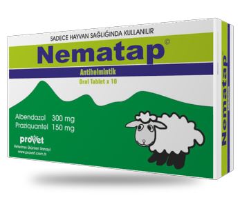 BİLEŞİMİ Her tablette 300 mg albendazole, 150 mg praziquantel bulunur. KULLANIM SAHASI Koyunlarda albendazol - praziquantel kombinasyonuna duyarlı mide-barsak ve akciğer kıl kurtları, şeritler ve karaciğer kelebekleri ile mücadelede kullanılır. Kombinasyonun etkili olduğu parazit türleri; Mide-barsak kıl kurtları: Haemonchus contortus , Ostertagia spp., Trichostrongylus spp., Cooperia spp., Nematodirus spp., Bunostomum spp., Oesophagostomum spp., Akciğer kıl kurtları: Dictyocaulus spp. Şeritler: Moniezia expansa , Moniezia benedeni Karaciğer kelebekleri: Ergin Fasciola hepatica , Dicrocoelium dentriticum KULLANIM ŞEKLİ VE DOZU Oral yolla yutturularak kullanılır. Veteriner hekim tarafından başka şekilde tavsiye edilmediği taktirde, Genel farmakolojik doz: Albendazol için Kılkurtlarına: 7.5 mg / kg c.a Praziquantel için Şeritlere ( Moniezia spp.) 3.75 mg / kg c.a İlkbaharda meraya çıkmadan önce ve sonbaharda meradan döndükten sonra yılda iki uygulama yapılır. Verilecek Tablet Sayısı için Pratik Tablo