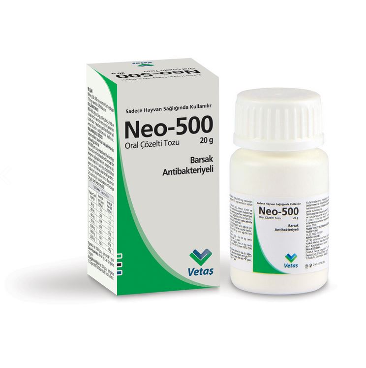 BİLEŞİMİ KULLANIM SAHASI/ENDİKASYONLAR Böbrek yetmezliği olan, denge ve işitme organları ile ilgili hastalığı olan hayvanlarda kullanılması kontrendikedir. KULLANIM ŞEKLİ VE DOZU Neomisinin genel farmakolojik dozu sığır, koyun ve keçilerde 15 mg /kg canlı ağırlık/gün, kanatlılarda (tavuk, ördek ve hindi) 10 mg/kg canlı ağırlık/gün olacak şekilde aşağıdaki doz tablolarında belirtilen miktarlarda NEO-500 içme suyu veya süte katılmak suretiyle hayvanlara verilir. İçme sularında homojen bir karışımın sağlanabilmesi için, hesaplanan ilaç miktarı önce 3 - 5 lt suda iyice çözdürüldükten sonra, su tanklarına aktarılarak karıştırılır. Tedaviye başlamadan önce hayvanlar 2-3 saat süreyle susuz bırakılırlar. Tedaviye 3-5 gün süre ile devam edilir. Kanatlı için Doz Tablosu;