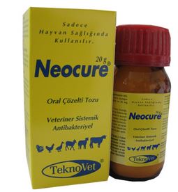 BİLEŞİMİ 1 gramında; 250 mg Oksitetrasiklin, 161.3 mg Neomisin ve 25 mg pektin içerir. KULLANIM YERİ / ENDİKASYONLARI Neocure Oral Çözelti Tozu duyarlı bakteriler tarafından meydana getirilen; Tavuk, hindi ve ördeklerde; kronik solunum sistemi hastalığı (CRD), mavi ibik, bulaşıcı koriza, enfeksiyöz sinüzitis, hava kesesi iltihabı, kanatlı kolerası gibi enfeksiyonların, Buzağı, kuzu ve oğlaklarda; bakteriyel enteritis, septisemi, solunum ve sindirim sistemi enfeksiyonlarının tedavisinde kullanılır. KULLANIM ŞEKLİ VE DOZU Veteriner Hekim tarafından başka bir şekilde tavsiye edilmediği taktirde farmakolojik dozu; Neomisin baz alınarak 10 mg/kg canlı ağırlık/gündür. Kuzu ve oğlaklarda; 20 kg canlı ağırlığa 1.2 g Neocure Oral Çözelti Tozu, Buzağılarda; 50 kg canlı ağırlığa 3 g Neocure Oral Çözelti Tozu bir miktar su ile karıştırılarak içirilir. Süt ile karıştırılmamalıdır. Tavuk, hindi ve ördeklerde; 50 kg canlı ağırlığa 3 g Neocure Oral Çözelti Tozu içme suyuna karıştırılarak verilir. Uygulamadan 2-3 saat önce hayvanların susuz bırakılması önerilir. İlaçlı su her gün taze olarak hazırlanmalıdır. Tüm türlerde tedaviye 3-5 gün süre ile devam edilir. |