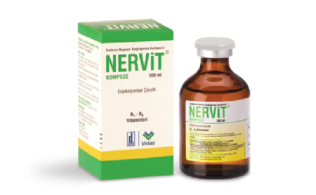 Sadece Hayvan Sağlığında Kullanılır BİLEŞİMİ NERVİT KOMPOZE Enjeksiyonluk Çözelti, renksiz, berrak, steril bir enjeksiyonluk çözelti olup beher ml’de 100 mg Vitamin B1 ile 10 mg Vitamin B6 içerir.FARMAKOLOJİK ÖZELLİKLERİ NERVİT KOMPOZE Enjeksiyonluk Çözelti, B grubu vitaminlerden tiamin (Vitamin B1) ile pridoksin (Vitamin B6) kombinasyonudur. Tiamin (Vitamin B1), insan ve hayvan vücudunda ATP tarafından fosfatlanarak, tiamin difosfata dönüşür. Tiamin difosfat vücutta karbonhidratların ara metabolizmasında rol oynayan önemli bir koenzimdir. Tiamin, pirofosforik asit esteri şeklinde karbonhidrat metabolizmasına katılıp katalizör görevi yaparak aktif asetik asidin ortaya çıkmasını sağlar. Aktif asetik asit dokularda görülen pirüvik ve laktik asit birikimini ortadan kaldırarak sinirsel uyarıların iletimine katılan asetilkolin’in ortaya çıkmasında büyük rol oynar. Buna bağlı olarak B1 Vitamini enjeksiyonundan kısa süre sonra organizmanın karbonhidrat ve yağ metabolizmasının ve sinirsel fonksiyonların düzene girdiği, büyümenin ise hızlandığı görülür. Kas içi uygulandığında hızla emilir ve birçok vücut dokusuna dağılır. Tiaminin emilimi büyük ölçüde duodenum ve ince barsakların üst kısmında gerçekleşir. Vücut gereksinimi kadar olan kısmı depolanır kalan kısmı da parçalanmış metabolitler halinde idrarla atılır. Pridoksin (Vitamin B6), hidroksillenmiş ve iki metil alkol grubu içeren bir piridin türevidir. Aminoasitlerin katabolizma ve anabolizmaları ile ilgili enzim reaksiyonlarında koenzim olarak aktivite gösterir. Bu bakımdan aminoasit metabolizması ile karbonhidrat, yağ asitleri ve enerji metabolizması arasında önemli bağlantı kurar. Aynı zamanda, hemoglobinin şekillenmesi için de gereklidir. Pridoksin parenteral yolla verildikten sonra kolayca emilir ve tüm vücuda dağılır. Emilimin ardından, pridoksal fosfat ve pridoksamin fosfata dönüşür. Başlıca karaciğerde metabolize olur. 4-piridoksik asit ve diğer inaktif metabolitlerine okside olur idrarla atılır. Rumen mikroflora dengesinin bozulduğu, rumen asidozu ve alkolozu gibi her türlü gıdai indigesyonlarda ve gastrointestinal enfeksiyonlarda tüm B vitaminleri gibi, B1ve B6 vitaminlerinin sentezi de yavaşlar ya da durur. Ayrıca emilimleri de engellenir. KULLANIM SAHASI/ENDİKASYONLAR NERVİT KOMPOZE Enjeksiyonluk Çözelti, B1 ve B6 vitaminlerinin eksikliklerinden kaynaklanan durumlarda endikedir. - Eğrelti otu gibi tiaminaz enzimi içeren bitkilerle zehirlenmeler, çiğ balıkla beslenme ve amprolyum uygulamaları da antagonizma nedeniyle B1 vitamini noksanlığında, - B1ve B6 vitamin eksikliğine bağlı olarak ortaya çıkan ve sebepsiz gibi görülen duyarlık artışı, ışığa duyarlılık, iştah kaybı, gelişme yavaşlaması veya durması, kuru kepekli dermatit, kıl dökülmesi, lens bozuklukları, korneada vaskülarizasyon ve katarakt, yürüyüş bozuklukları, ataksi, epileptik kramplar, pareziler, genel zayıflık, periferik sinirlerde miyelin kaybı, mikrositer veya hipokromik anemi, kusma, yutma güçlüğü, rezorbsiyon bozuklukları ve sindirim sistemi mukozası bozukluğuna bağlı diyarelerde destek olarak, poliensefalomalazi oluşturan hastalıklar, rumen asidozu ve alkolozu, gastro intestinal sisteme bağlı bozukluk ve enfeksiyonların tedavisinde destek amaçlı kullanılır. KULLANIM ŞEKLİ VE DOZU Veteriner hekim tarafından başka şekilde tavsiye edilmediği takdirde;