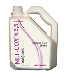 BİLEŞİMİ: Her 1 ml'si; 25 mg toltrazuril içeren berrak, sarımsı renkte, akışkan bir oral çözeltidir. KULLANIM SAHASI/ENDİKASYONLARI: Tavuk ve hindilerin koksidiosis hastalığından korunmasında ve tedavisinde kullanılır. Net-Cox %2,S Oral Çözelti'nin etki alanına giren koksidiosis etkenlerinin en önemlileri aşağıdadır: Tavuklarda: Eimeria acervulina, Eimeria brunetti, Eimeria maxima, Eimeria mivati, Eimeria necatrix, Eimeria tenella Hindilerde: Eimeria adenoides, Eimeria meleagrimitis. UYGULAMA SEKLİ VE DOZU: Veteriner hekim tarafından başka bir şekilde önerilmemiş ise; koksidiosis sağaltımında, 2 gün süre ile 7 mgAg/ C.A günlük farmakolojik doz hesabıyla kullanılır. Buna göre 1000 kg canlı ağırlığa 280 ml ilaç; pratik günlük dozu ifade eder. İlaçlı su iki şekilde hazırlanabilir.