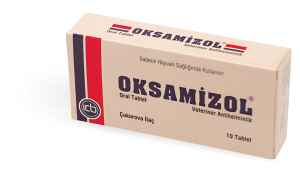 BİLEŞİMİ OKSAMİZOL Oral Tablet; beyaz-kremsi renkli, iki yüzü bombeli, ortasından çentikli bolus şeklinde tablet olup; her tablet 300 mg Oksfendazol ve 600 mg Oksiklozanid ihtiva eder. KULLANIM YERİ/ENDİKASYONLAR OKSAMİZOL Oral Tablet; sığır ve koyunların mide-bağırsak ve akciğer kurtlarının ergin, larva ve yumurtalarının, karaciğer kelebeklerinin erginlerinin ve Moniezia spp. erginlerinin tedavisi ve korumasında kullanılır. Karaciğer kelebekleri: Fasciola hepatica ve Fasciola gigantica (ergin) Mide bağırsak kılkurtları: Mide: Haemonchus sp.,Ostertagia sp.,Trichosrongylus axei İnce Bağırsak: T.colubriformis, Trichostrongylus sp., Nematodirus sp., Cooperia sp., Bunostomum sp., Gaigeria pachyscelis Kalın Bağırsak: Chabertia ovina , Oesophagostomum sp., Trichuris sp. Akciğer kılkurtları: Dictyocaulus spp. Barsak şeritleri: Moniesia sp. UYGULAMA ŞEKLİ VE DOZU Veteriner hekim tarafından başka şekilde tavsiye edilmediği takdirde farmakolojik doz ; Koyunda 5-7,5 mg/kg canlı ağırlık Oksfendazol, 15-20 mg/kg canlı ağırlık Oksiklozanid; Sığırda 5 mg/kg canlı ağırlık Oksfendazol, 10-15 mg/kg canlı ağırlık Oksiklozanid şeklindedir. Pratik Doz: Kuzu (20 kg) : Yarım Oral Tablet Koyun (40 kg) : 1 Oral Tablet Danalara (100-200 kg) : 2-3 Oral Tablet Sığırlara (200-300 kg) : 3-4 Oral Tablet şeklindedir. Sığırlarda 300 kg canlı ağırlık (c.a.) üzerindeki hayvanlara başta verdiğimiz canlı ağırlıklı dozları esasına göre ilave dozlar verilir. Ancak bir seferde verilecek dozlar sığırlarda 7-9, danalarda 4-5, buzağılarda 2-3 tableti geçmemelidir. OKSAMİZOL Oral Tablet, hayvanlara doğrudan yutturularak veya su içinde eritilerek içirmek şeklinde verilir. Tabletler gerektiğinde ortasındaki çentikten kırılarak yarım oral tablet halinde de kullanılabilir. |