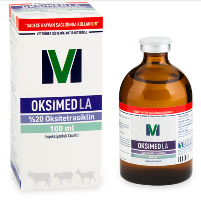 Bileşimi: Farmakolojik Özellikleri: Oksitetrasikline karşı mikroorganizmaların duyarlılıkları aşağıdaki gibidir. Endikasyonları: Kullanım Şekli ve Dozu: 'Veteriner hekim tarafından başka şekilde tavsiye edilmediği takdirde;’ OKSIMED LA Enj. Çöz., tüm hayvanlarda kas içi yoldan uygulanır. GIDALARDAKİ İLAÇ KALINTILARI HAKKINDA UYARILAR İlaç Kalıntı Arınma Süreleri (i.k.a.s.); tedavi süresince ve son ilaç uygulamasından sonra 28 gün geçmeden sığır, keçi ve koyunlar kesime gönderilmemelidir. Tedavi süresince ve son ilaç uygulamasından sonra 12 gün (24 sağım) süreyle elde edilen inek, koyun ve keçi sütü tüketime sunulmamalıdır. Sütteki ilaç kalıntı arınma süresinin uzun olması nedeniyle; insan tüketimi için süt elde edilen sığır, koyun, keçilere uygulanması tavsiye edilmez. KONTRENDİKASYONLAR Damar içi yolla uygulanmaz. At, kedi ve köpeklerde kullanılmamalıdır. Tetrasikline duyarlı hay¬vanlarda, karaciğer ve böbrek yetmezliği olanlarda kullanılmamalıdır. Gebelikte kullanım: Tetrasiklinler yan etkileri nedeniyle gebeliğin ilk ve son 1/3 ünde kullanılmamalıdır. Ancak koyunlarda Chlamydia sp. tarafından meydana getirilen abortlarda, hekim ve hayvan sahibi tarafından fayda-zarar hesabı yapılarak kullanılabilir. TİCARİ TAKDİM ŞEKLİ |