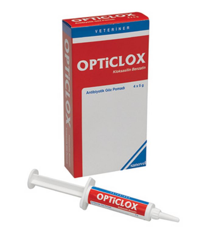BİLEŞİMİ Her g’da, 213 mg kloksasilin benzatin içerir. ENDİKASYONLARI Opticlox sığır, koyun, at, köpek ve kedilerde Stafilokok sp. ve Basillus sp.’lerin neden olduğu göz enfeksiyonlarının tedavisinde kullanılır. KULLANIM ŞEKLİ VE DOZU Opticlox sığır, koyun, at, köpek ve kedilerin göz enfeksiyonlarının tedavisinde lokal uygulama yoluyla kullanılır. Bu uygulama için alt göz kapağı kaldırıldıktan sonra pomat dikkatlice şerit halinde konjunktival boşluğa sıkılır. Pratik Doz Tablosu: Hayvan Türü Doz Sığır ve At Göz başına yaklaşık 5-10 cm’lik şerit. Koyun Göz başına yaklaşık 5 cm’lik şerit. Kedi ve Köpek Göz başına yaklaşık 2 cm’lik şerit. Normalde tek bir uygulama yeterlidir, gerekli görüldüğünde 48 - 72 saat sonra ikinci bir uygulama yapılabilir. Tek gözü enfekte olmuş hayvanlarda olası çapraz bulaşmaları önlemek amacı ile her iki gözün de ilaçlanması tavsiye edilir. Bu durumda enfeksiyon transferini önlemek amacı ile uygulamaya sağlıklı gözden başlanır. |