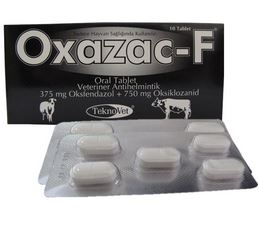 BİLEŞİMİ Her tablet 375 mg Oksfendazol ve 750 mg Oksiklozanid içerir. KULLANIM YERİ /ENDİKASYONLARI Oxazac Oral Tablet; sığır ve koyunlarda mide-barsak ve akciğer kıl kurtlarının ergin, larva ve yumurtalarına, karaciğer kelebekleri erginleri ve Moniezia sp. erginlerine karşı hayvanların tedavi ve korunmasında antihelmintik olarak kullanılır. Mide barsak kıl kurtları: Mide: Haemonchus sp., Ostertagia sp., Trichostrongylus axei, İnce Barsak: T. colubriformis,Trichostrongylus sp., Strongyloides sp., Nematodirus sp., Cooperia sp., Bunostomum sp., Gaigeria pachyscelis, Kalın Barsak: Chabertia ovina, Oesophagostomum sp.,Trichuris sp., Akciğer kıl kurtları; Dictyocaulus sp. ergin ve larva formlarına etkilidir. Barsak şeritleri; Moniezia sp., Karaciğer kelebekleri; Fasciola hepatica, Fasciola gigantica (ergin). KULLANIM ŞEKLİ VE DOZU Oxazac Oral Tablet’in etkin maddelerinden olan Oksiklozanid, sığırlara; 10 - 15 mg/kg canlı ağırlık, koyunlara; 10 - 20 mg/kg canlı ağırlık ve Oksfendazol, sığırlara; 4.5 - 5 mg/kg canlı ağırlık, koyunlara; 5 - 7.5 mg/kg canlı ağırlık doz hesabıyla; pratik olarak 50 kg canlı ağırlığa 1 tablet olacak şekilde verilir. Veteriner hekim tarafından başka şekilde tavsiye edilmediği takdirde;