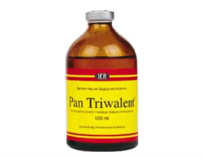 BİLEŞİMİ PanTriwalent Enjeksiyonluk Çözelti; 1 ml.’de 30 mg. Oksitetrasiklin hidroklorür içeren sarı renkte berrak çözeltidir. Pan Triwalent Enjeksiyonluk Çözelti; sığır, koyun, at, köpek ve kedilerde duyarlı bakteriler tarafından meydana getirilen solunum, sindirim, ürogenital sistem, yumuşak doku enfeksiyonları, viral enfeksiyonlara karışan sekonder bakteriyel enfeksiyonlar, septisemi gibi oksitetrasikline duyarlı mikroorganizmaların neden olduğu enfeksiyonlarda ve özellikle; Pan Triwalent Enjeksiyonluk Çözelti, 10 mg/kg/canlı ağırlık/gün dozunda uygulanmalıdır. Uygulama kas içi, damar içi, deri altı yollarla yapılabilir. Tedavi süresi hastalığın şiddetine göre 3-5 gün olabilir. Kas içi enjeksiyonlar büyük kaslara (boyun,sağrı) derin kas içi yolla uygulanmalıdır. Büyük hacimlerin bir hayvana uygulanması sözkonusu olduğunda, toplam hacim 10 ml’lik hacimler şeklinde bölünerek farklı bölgelere uygulanmalıdır. Atlara damar içi yolla 5 mg/kg canlı ağırlık/gün dozda yapılmalıdır. |