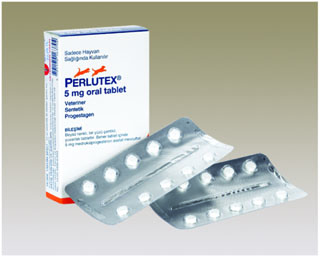 BİLEŞİMİ Beyaz renkli, bir yüzü çentikli, yuvarlak tablettir. Beher tablet içinde 5 mg medroksiprogesteron asetat mevcuttur. KULLANIM SAHASI/ENDİKASYONLAR • Dişi köpeklerde sadece östrusu durdurmak, • Dişi kedilerde östrusu uzun süre önlemek amacıyla kullanılır. KULLANIM ŞEKLİ VE DOZU Perlutex tablet ağız yoluyla kullanılır. Medroksiprogesteron asetatın kedi ve köpeklerde minimal etkin dozları östrus siklusunun dönemlerine göre değişir. Anöstrus dönemindeki hayvanlarda 1 kg vücut ağırlığı için yaklaşık 1 mg.dır. Veteriner hekim tarafından başka şekilde tavsiye edilmediği takdirde pratik uygulama dozları: Dişi köpeklerde: Östrusun durdurulması için: 4 Gün süre ile günde 2 tablet ve bunu takiben 12 gün süreyle günde 1 tablet. Vücut ağırlığı 15 kg.dan fazla olan köpeklere doz iki misline çıkarılmalıdır. Dişi kedilerde: Östrusu önlemek için: Haftada 1 tablet verilir. |