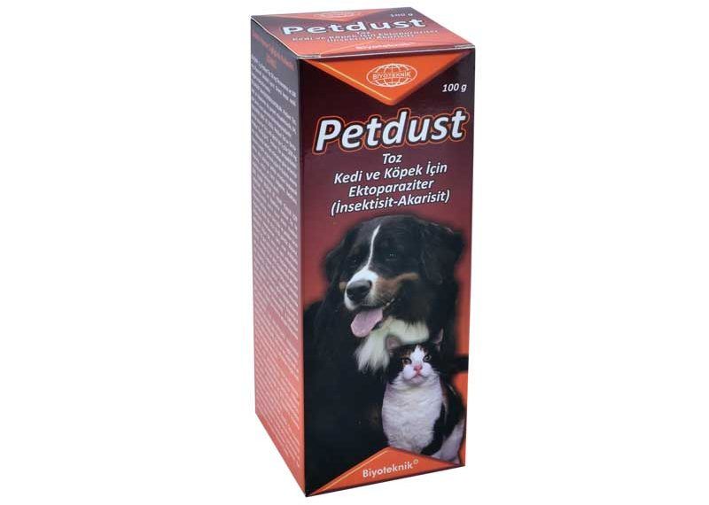 Petdust Toz Kedi ve Köpek İçin Ektoparaziter (İnsektisit – Akarisit) BİLEŞİMİ: 1 g Petdust Toz 10 mg Tetrametrin ve 100 mg Piperonil bütoksit içerir. Grimsi beyaz renkli kaygan ve akıcı bir tozdur. FARMAKOLOJİK ÖZELLİKLERİ: Petdust Toz kedi ve köpeklerin ve kene, bit, pire ve sineklere karşı kullanılan geniş spektrumlu bir insektisittir. Formülündeki Tetrametrin sentetik piretroit insektisitlerden biridir. Doğal piretrinlere benzer şekilde temas ve mide zehiri olarak etki eder. Piperonil bütoksit sinerjik etkisini göstererek Tetrametrin’in etkisini arttırır. Diğer sentetik piretroitler gibi Tetrametrin’in en önemli özelliği insekt parazitler üzerinde çok güçlü, hızla yok edici etkinliğe sahip olmasıdır. Bu gruptaki insektisitler önemli lipofilik özelliğe sahiptir. Böylece, parazit insektlerin lipoid moleküllerince zengin kutikulasından kolayca geçerek etki noktalarına ulaşır. Bu aşamadan sonraki zehirli etkileri iki yönlü olarak gelişir. Bir taraftan yüzeysel sinir ganglionlarına tutunarak parazitin bütün etkinliğini bloke eder. Diğer yandan da bir çeşit sinir zehiri gibi davranarak insekt parazitlerin sinir sistemini uyararak dengesiz hareketler, uyumsuzluk, kaslarda eksitasyon, konvulsiyon, genel felç durumu, koma ve ölüm meydana getirir. Üçüncü kuşak piretroitler gibi Tetrametrin geniş bir dış paraziter spektrumuna sahiptir. Etki alanına giren dış parazit çeşitleri arasında mera ve mesken keneleri, sokucu ve emici bit türleri, pireler, kan emici böcekler yer alır. Bu insektisitler, söz konusu dış parazitlerin yaşam siklüsünün her döneminde insektisidal etkinliğinin yanında ovisidal etkinlik de gösterir. Toksisite: 1-Tetramethrinin Dünya Sağlık Örgütü(WHO)’nün sınıflandırılmasına göre zehirlilik sınıfı III(üç)tür.2-Tetramethrinin sıçanlarda akut oral LD50’si ile akut dermal LD50’si >5000mg/kg-yem’dir. 3-Yine tetramethrinin sıçanlar için 6 ay boyunca yapılan yedirme denemelerinde belirlenen NOEL (herhangi bir etki elde edilemeyen doz düzeyi) dozu 1500mg/kg-yem’dir. KULLANIM SAHASI/ENDİKASYONLAR: Petdust Toz, kedi ve köpeklerin dış parazit mücadelesinde, bit, pire, kene, uyuz, kan emici bitlere karşı kullanılır.